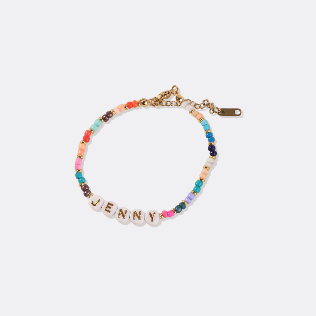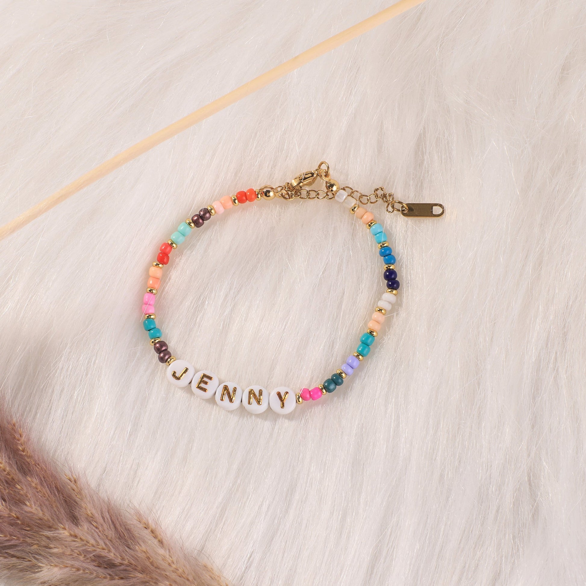 Dieses farbenfrohe Namensarmband mit bunt gemusterten Perlen bietet eine witzige und farbenfrohe Möglichkeit, Ihre Persönlichkeit am Handgelenk zu tragen. Es verleiht jedem Outfit einen Hauch von Fröhlichkeit und ist ein ideales Geschenk für Freunde, Familie oder sich selbst! Genießen Sie jeden Tag eine fröhliche Stimmung mit diesem verspielten Accessoire.
