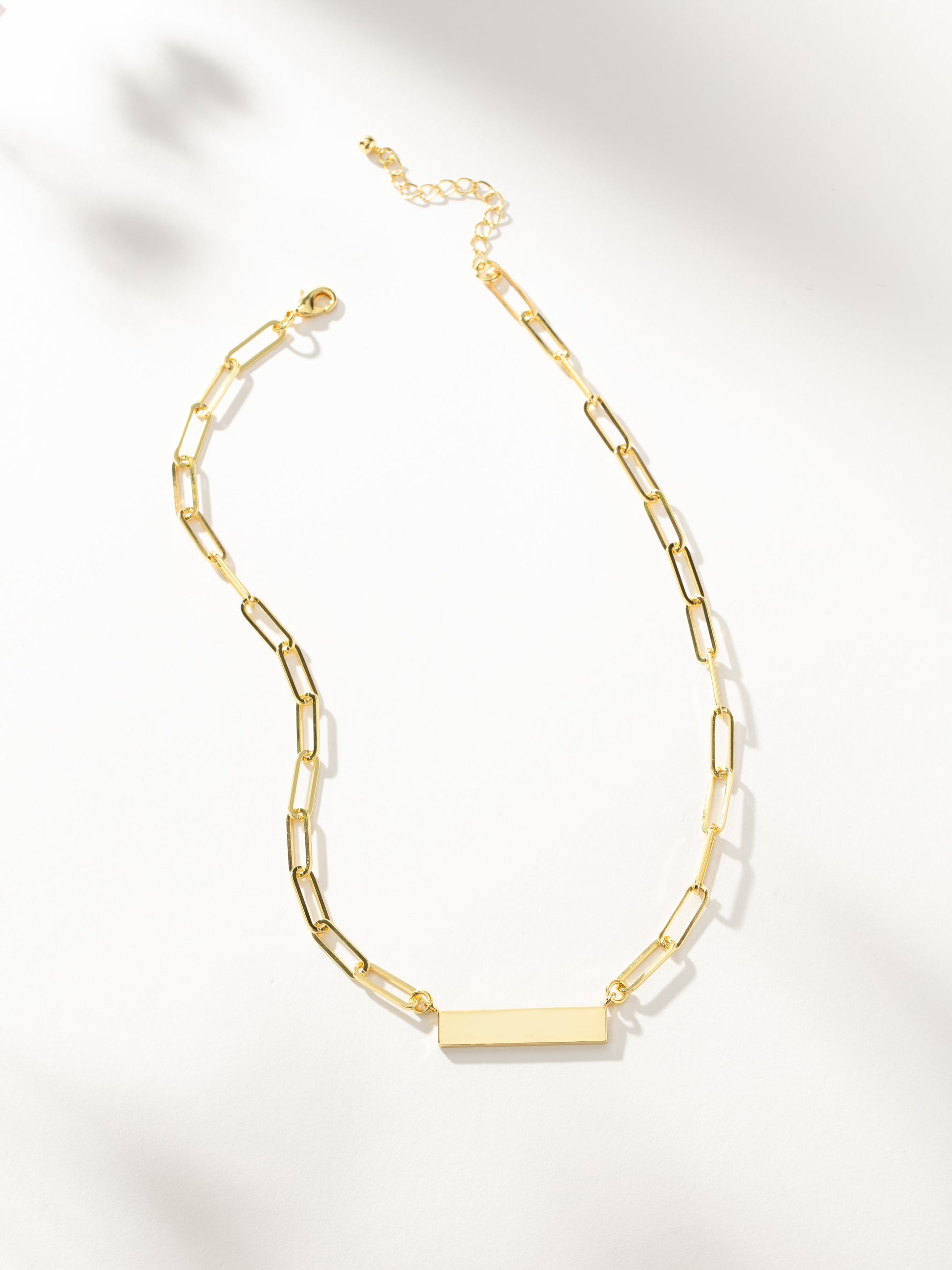Es gibt nichts Schlichtes und Unkomplizierteres als eine Kette mit Stab. Diese Kette mit Büroklammerkette und einem markanten rechteckigen Anhänger ist tatsächlich eine gravierbare Halskette! Ganz genau, Sie können diese Kette mit Anhänger mit allem personalisieren – mit einem Namen, einem Datum, einer besonderen Botschaft oder was auch immer Ihnen einfällt. Für einen individuellen Look wählen Sie bis zu 15 Zeichen, die Sie auf der Vorder- und/oder Rückseite eingravieren lassen möchten.