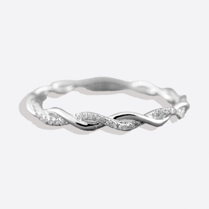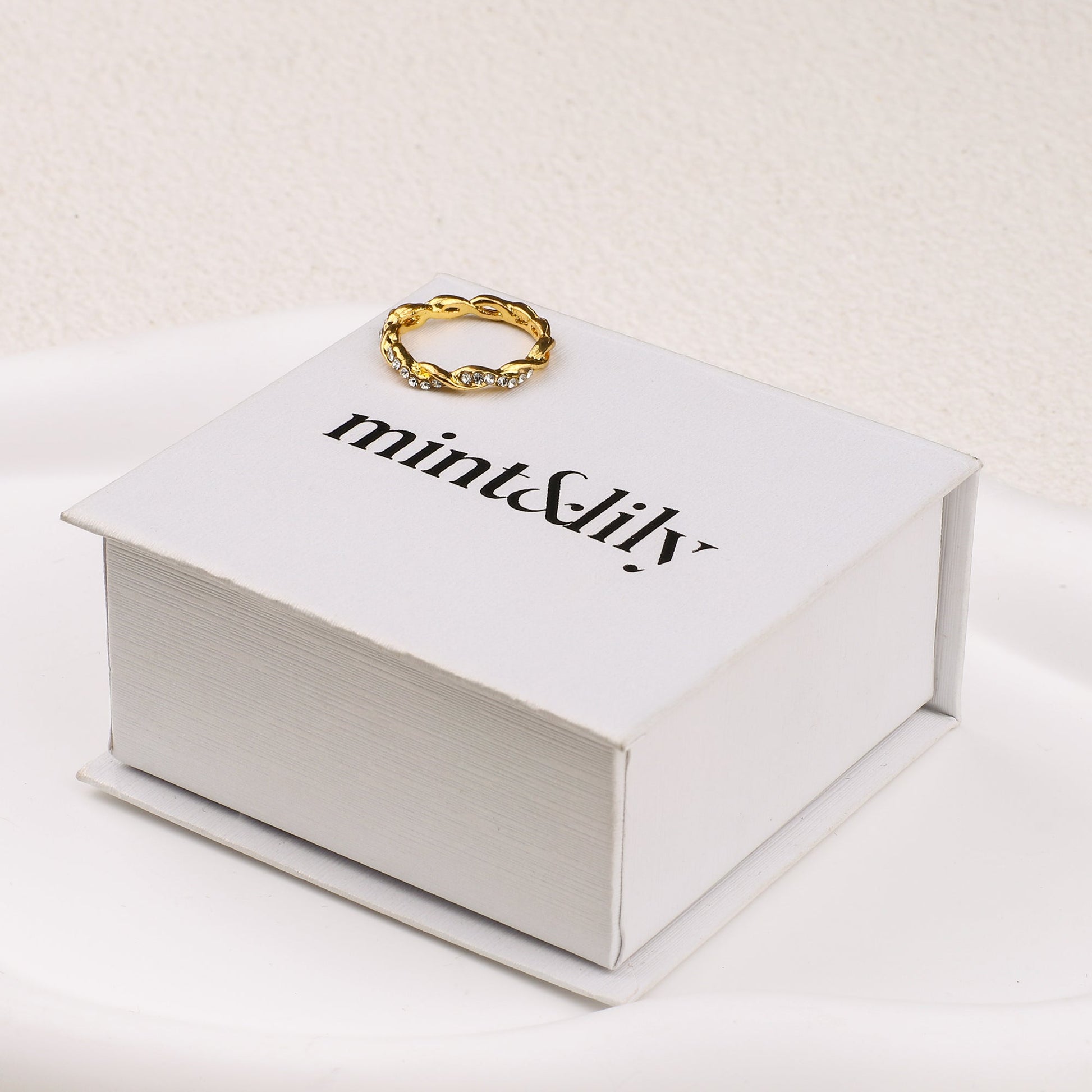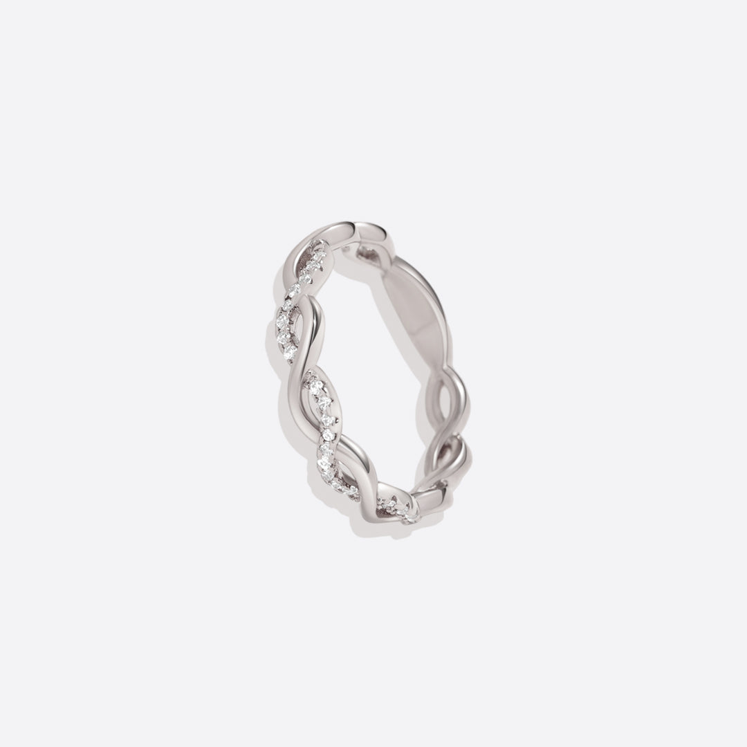 Dieses exquisite Schmuckstück besticht durch sein zartes Twist-Design und ist mit funkelnden, Pavé-gefassten Kunstdiamanten verziert, die das Licht wunderschön einfangen. Perfekt zum alleinigen Tragen für einen dezenten Schimmer oder kombiniert mit anderen Ringen für ein starkes Statement. Dieser Ring ist ideal für den Alltag und vereint Raffinesse mit Vielseitigkeit.