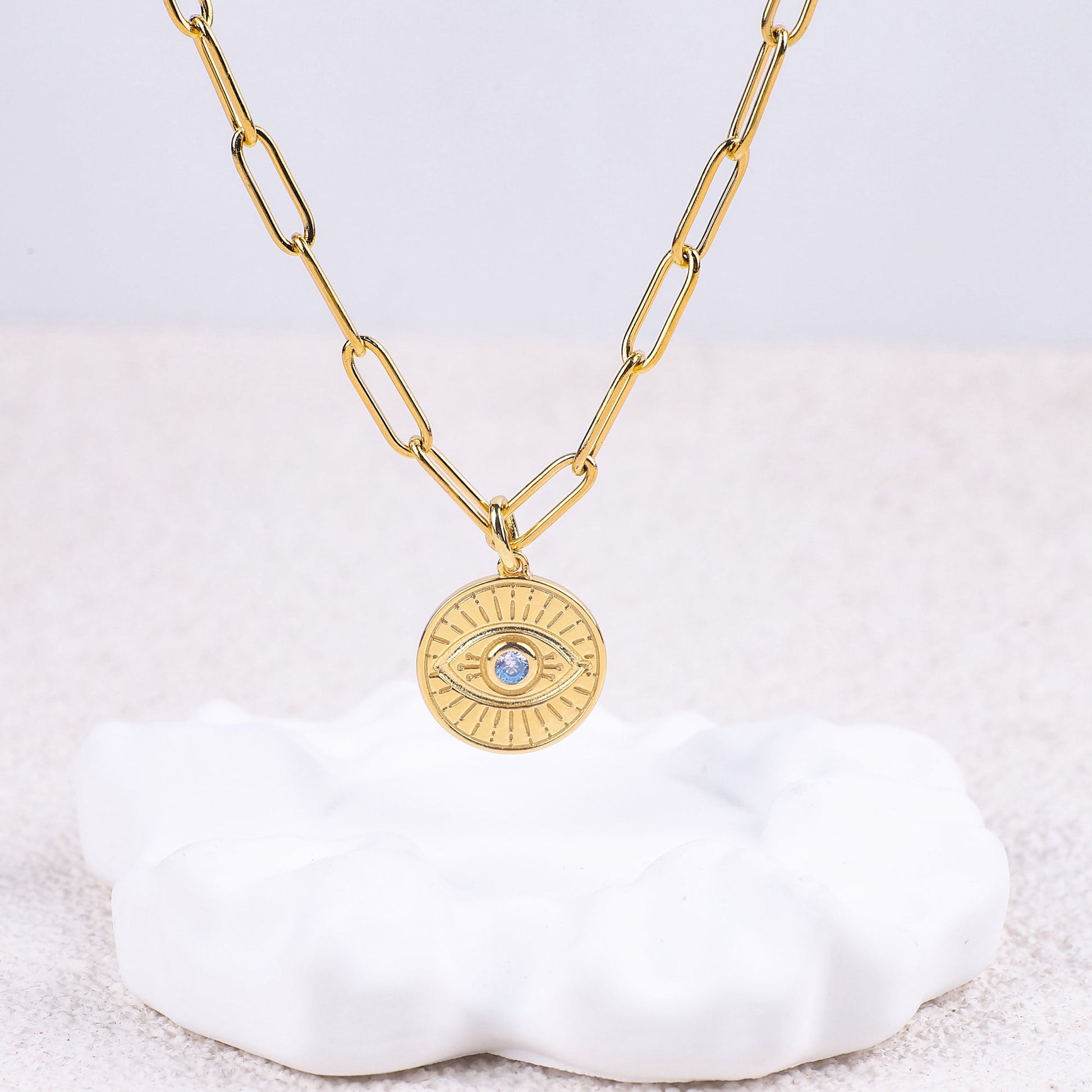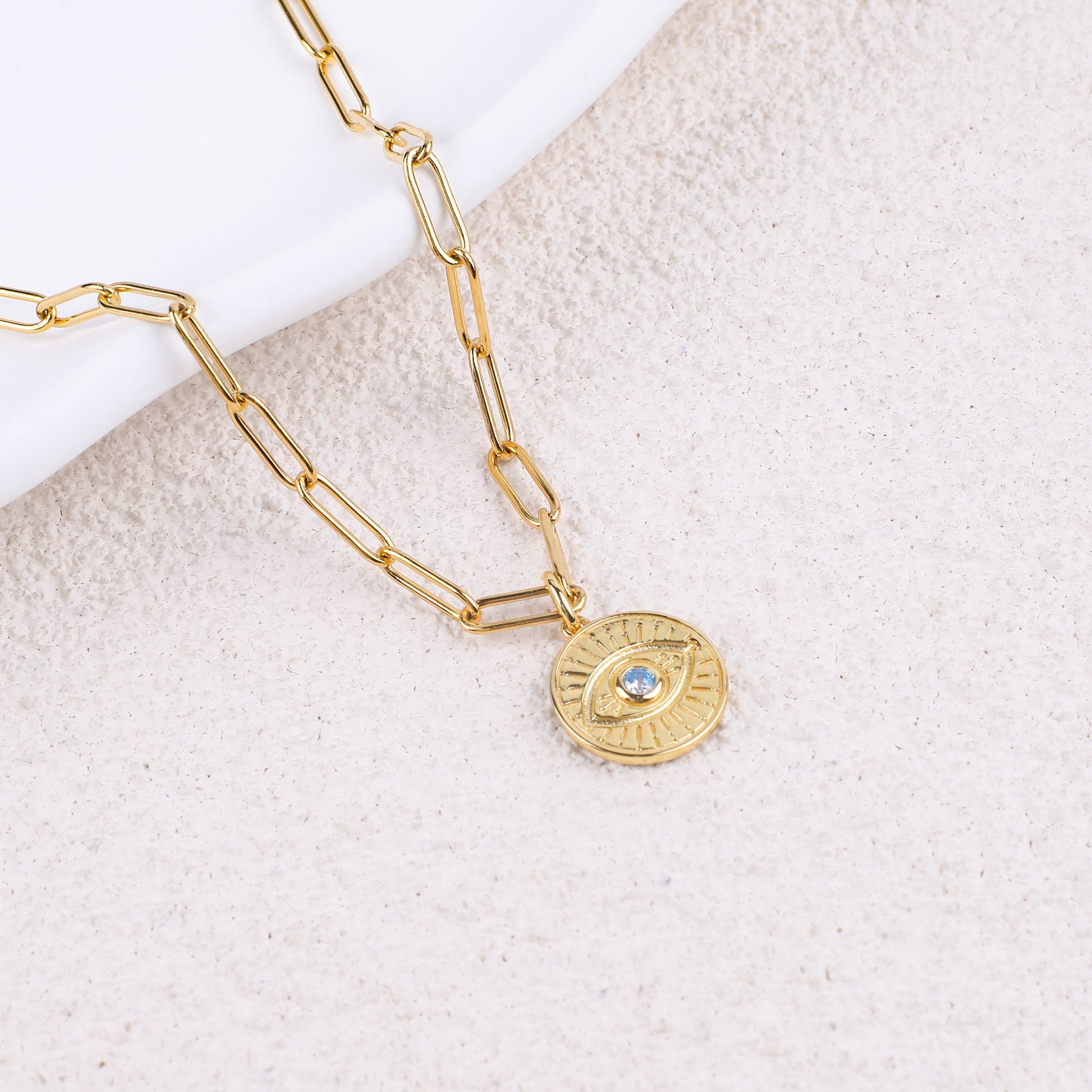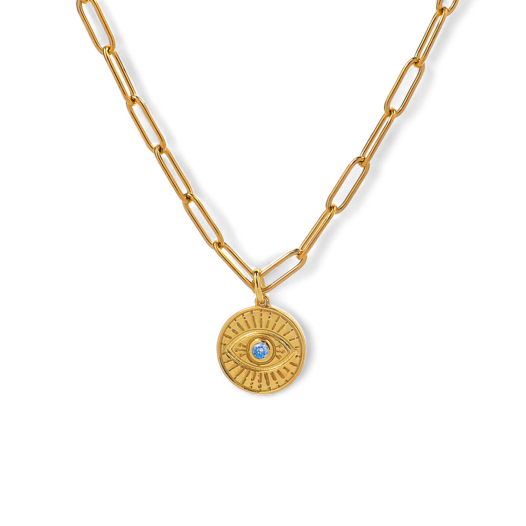 Der böse Blick, ein Symbol, das Schutz bietet und negative Energie abwehrt, ist wunderschön in das Design des Münzanhängers integriert. Dieses Emblem verleiht der Halskette eine besondere Bedeutung und macht sie zu einer perfekten Verbindung aus Stil und Tradition. Der Anhänger dient als modernes Amulett und macht die Halskette zu mehr als nur einem Accessoire, sondern auch zu einem Symbol für Glück und Sicherheit.