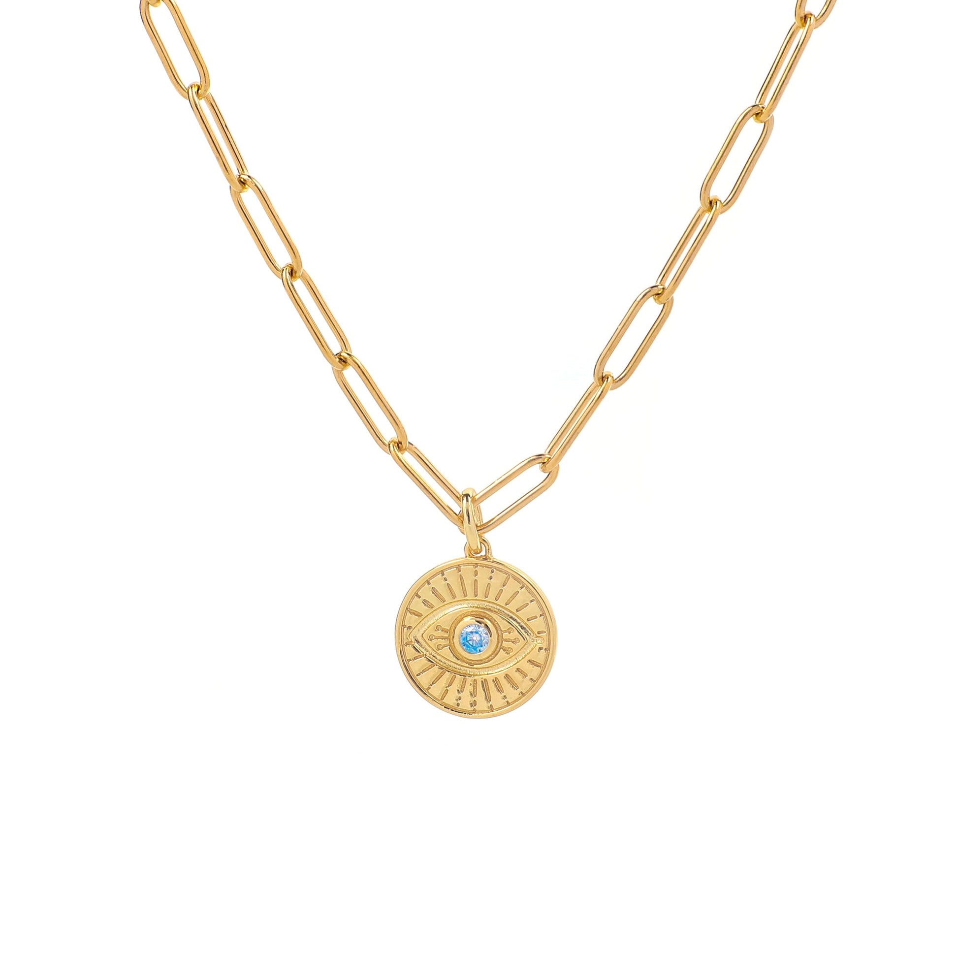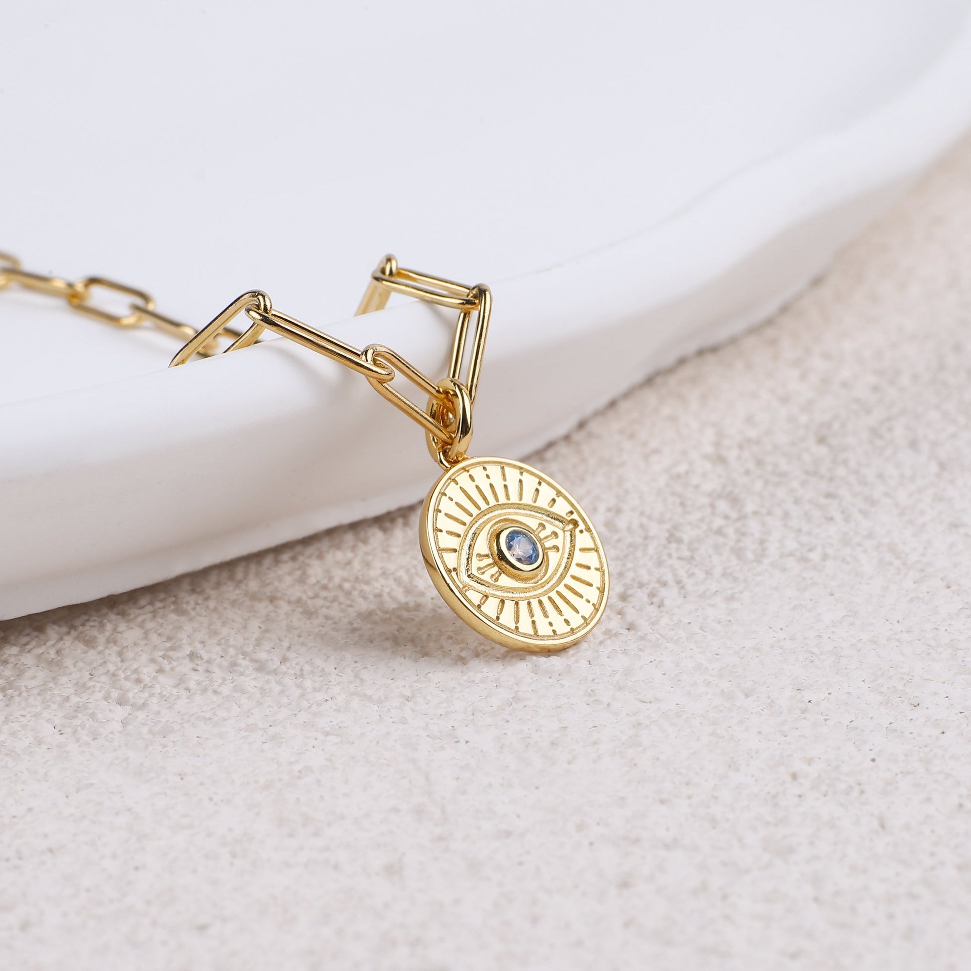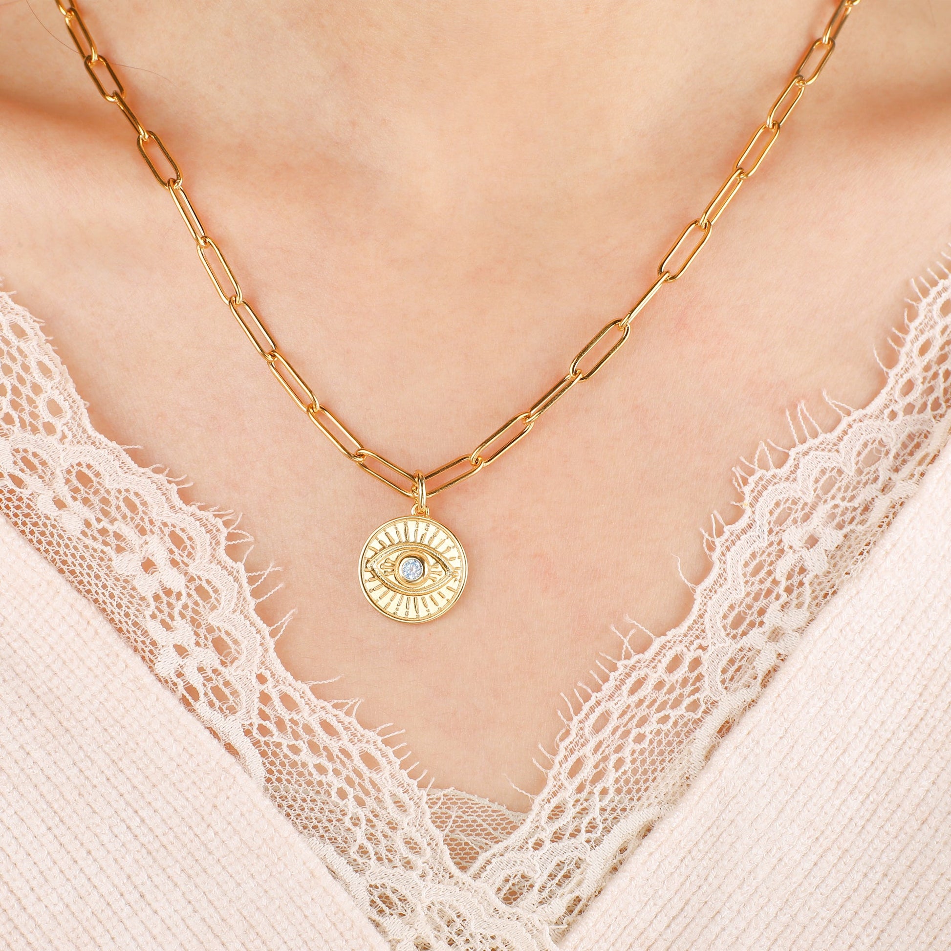 Der böse Blick, ein Symbol, das Schutz bietet und negative Energie abwehrt, ist wunderschön in das Design des Münzanhängers integriert. Dieses Emblem verleiht der Halskette eine besondere Bedeutung und macht sie zu einer perfekten Verbindung aus Stil und Tradition. Der Anhänger dient als modernes Amulett und macht die Halskette zu mehr als nur einem Accessoire, sondern auch zu einem Symbol für Glück und Sicherheit.