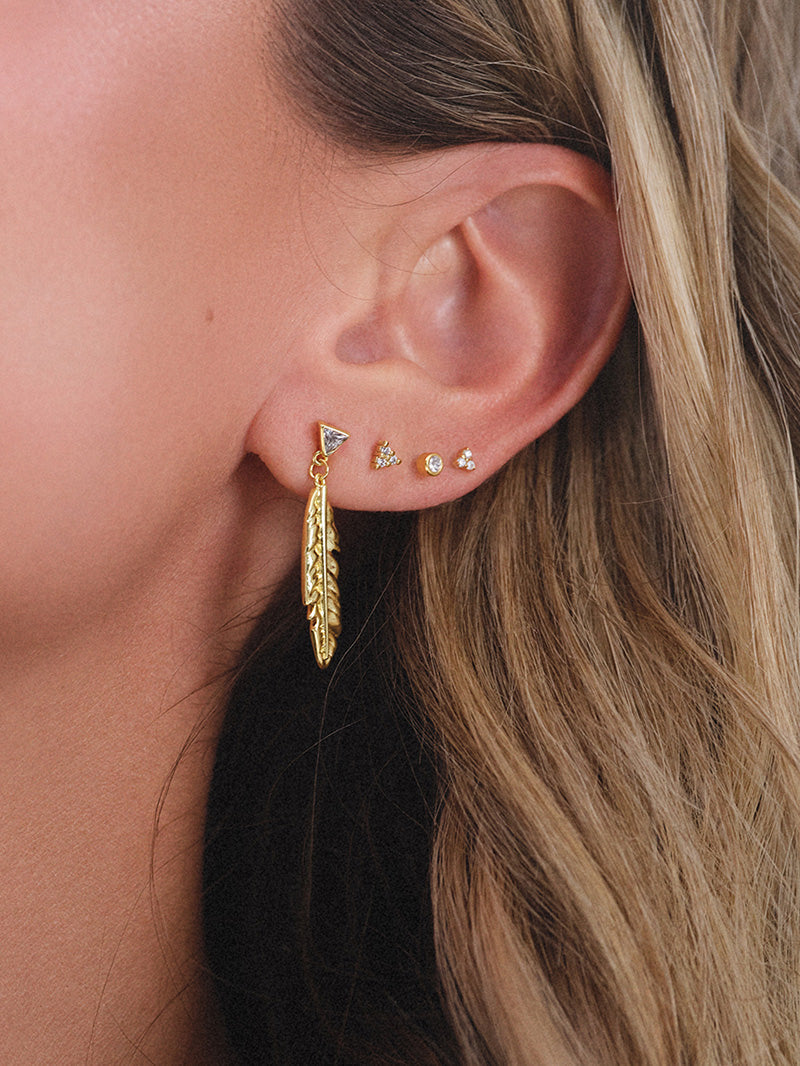 Mit unseren Federohrringen ziehen Sie garantiert alle Blicke auf sich. Diese goldenen Statement-Ohrringe mit Federanhänger und dreieckigem Ohrstecker lassen sich mühelos mit Ihrer restlichen Schmuckkollektion kombinieren. Um Kristins Look nachzubilden, kombinieren Sie diese Ohrstecker und Ohrhänger mit schlichten Ohrsteckern. Vergessen Sie nicht: Unsere passende Federkette brauchen Sie auch.
