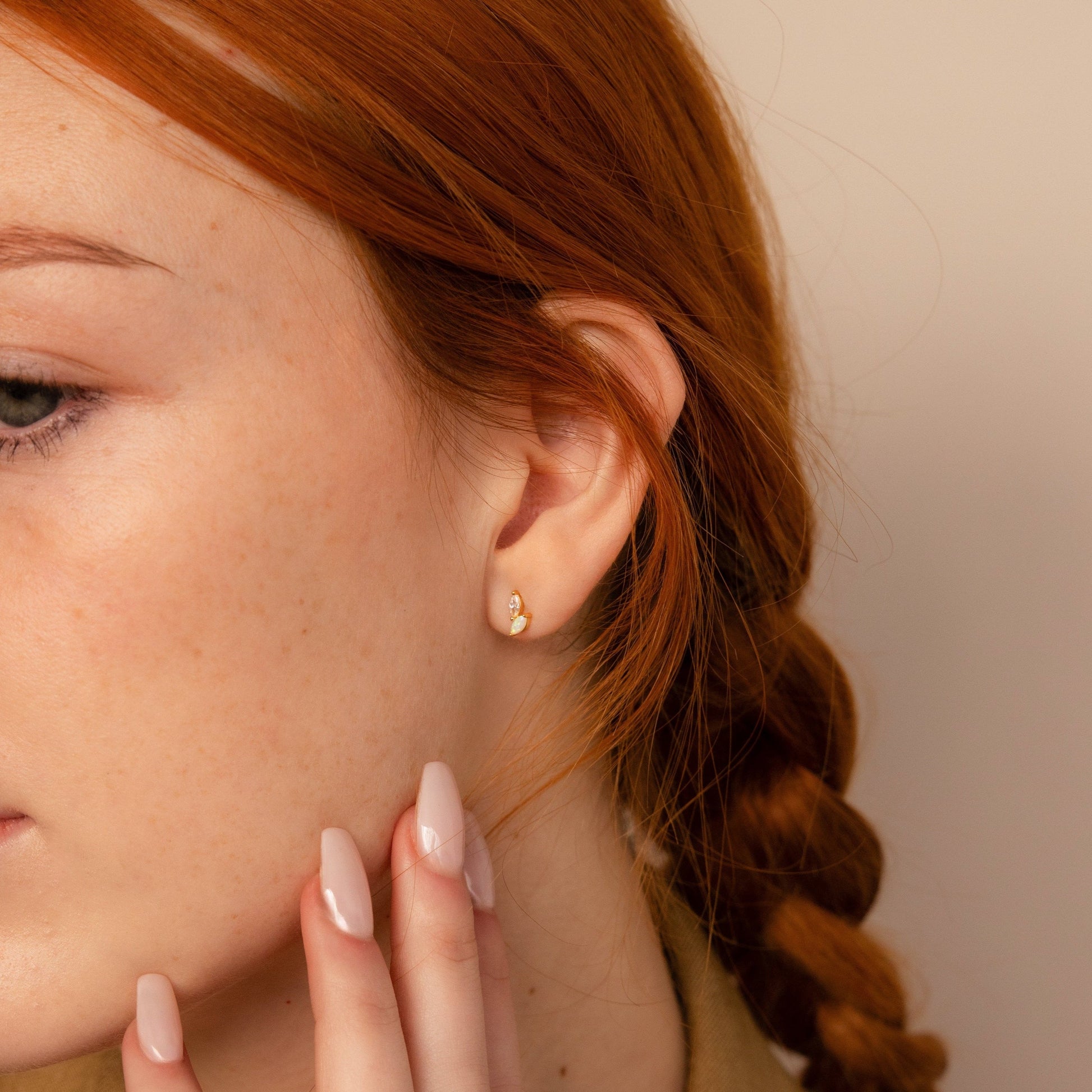 Das Modell präsentiert einen dezenten, zierlichen Look mit unseren Opal-Marquise-Ohrsteckern .