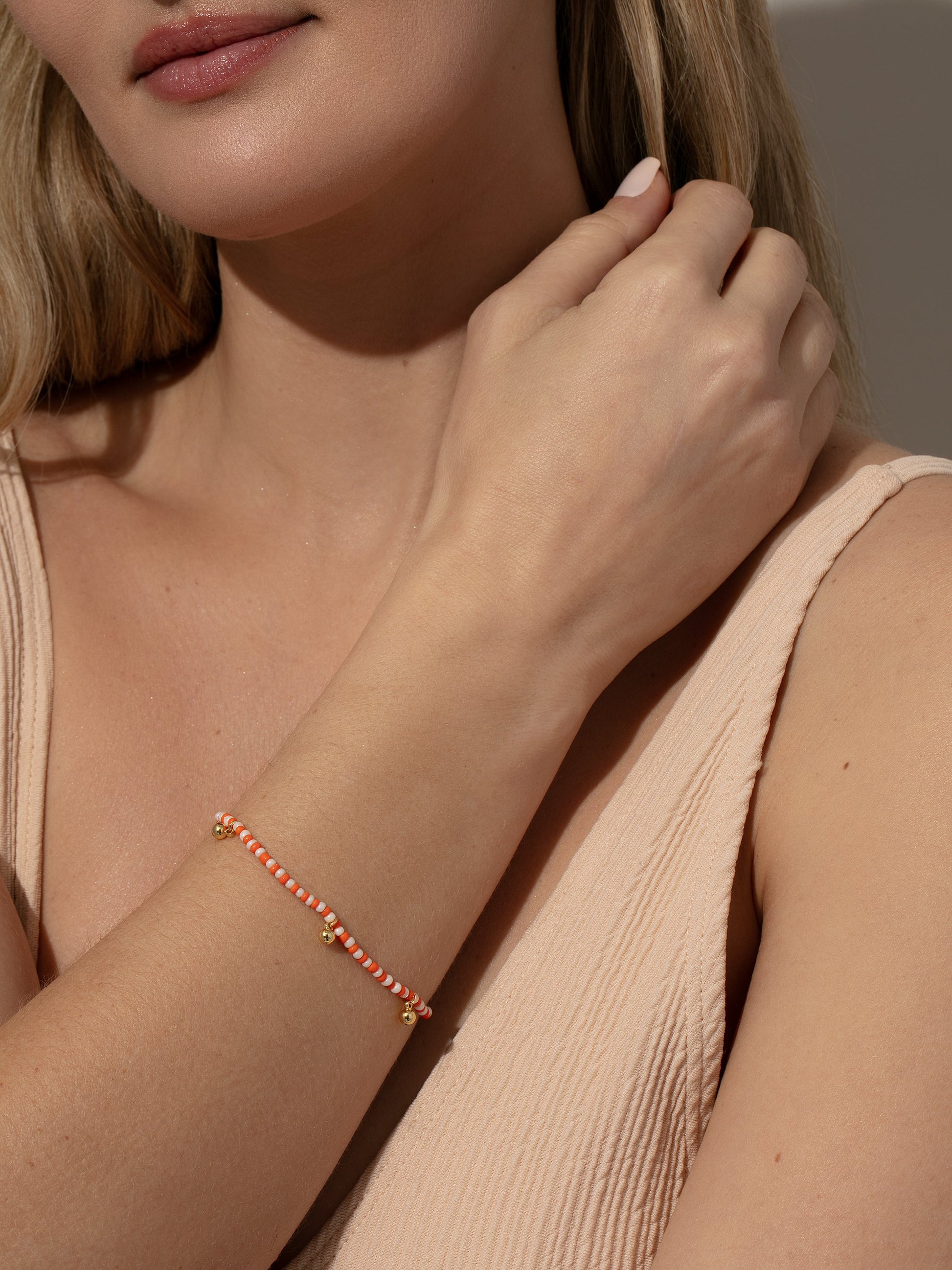 Tragen Sie ein Stück Sonnenuntergang mit diesem farbenfrohen Perlenarmband. Mit orangefarbenen und weißen Perlen und goldenen Anhängern ist es das ultimative Sommerarmband. Für einen farbenfrohen Look kombinieren Sie dieses Perlenarmband mit allem aus unserer farbenfrohen Schmuckkollektion .
