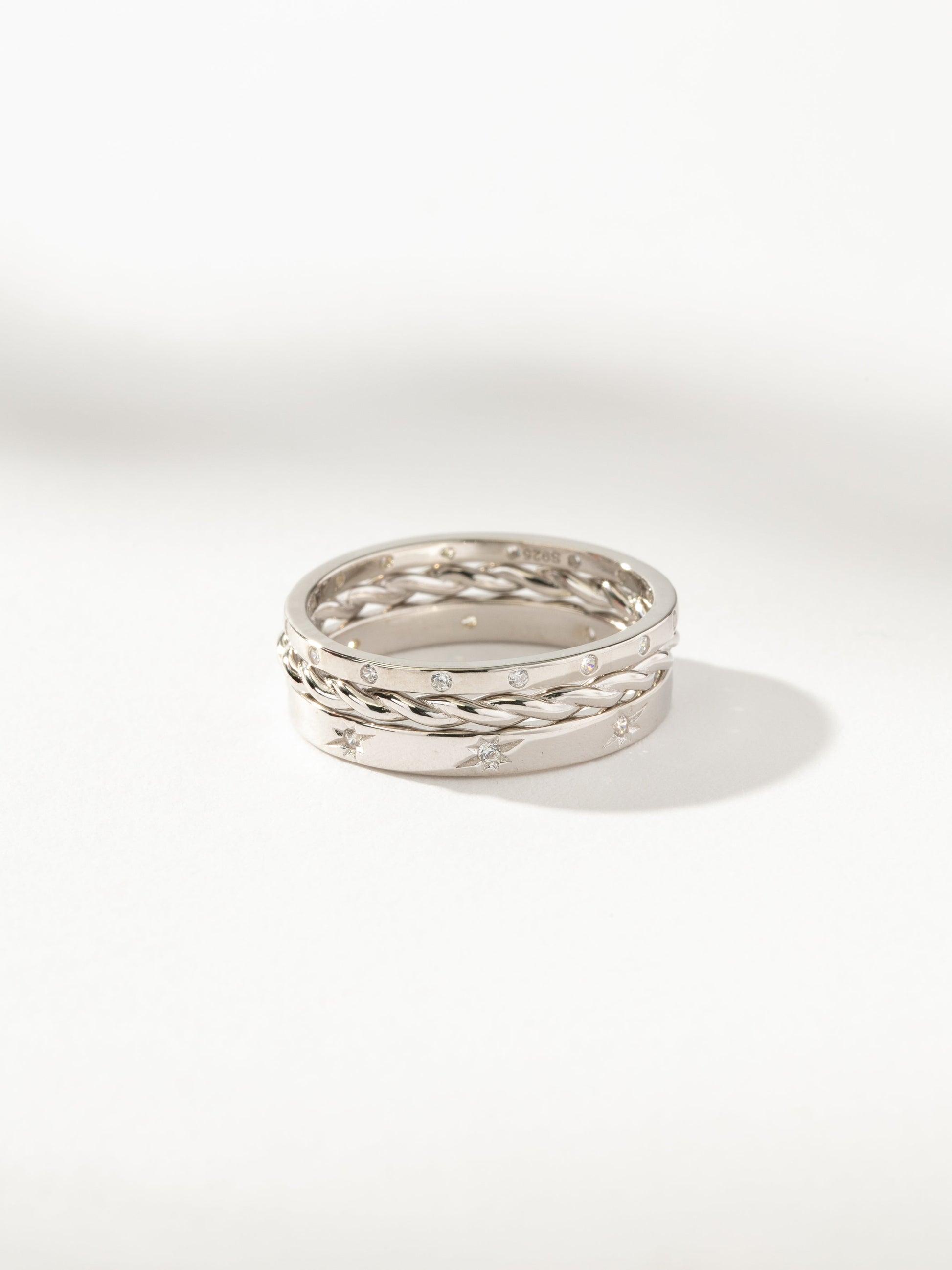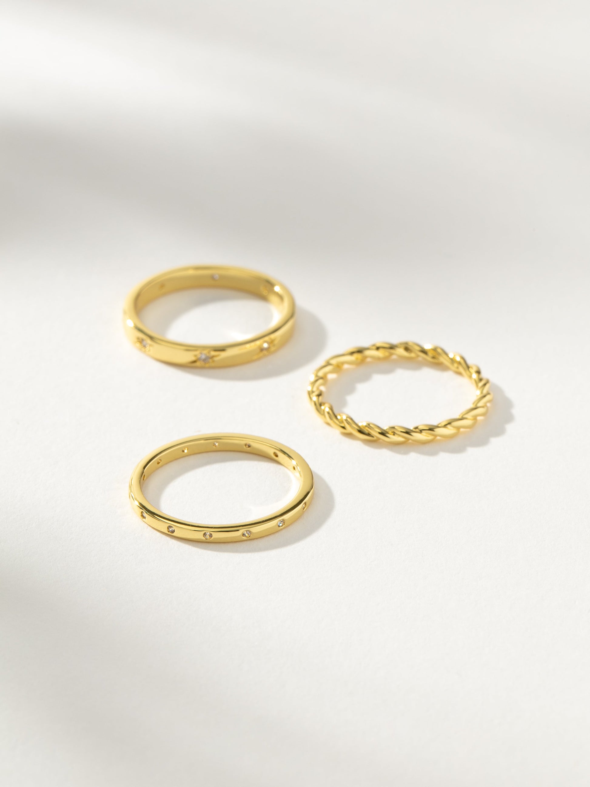 Kombinieren Sie Ihren Look mit unserem Triad-Ring-Set. Drei einzigartige Ringe – einer mit funkelnden Sternen, einer mit funkelnden Steinen und eine dünne Kordelkette – machen diese Stapelringe aus Sterlingsilber oder Gold zu Ihrem unverzichtbaren Begleiter im Alltag.