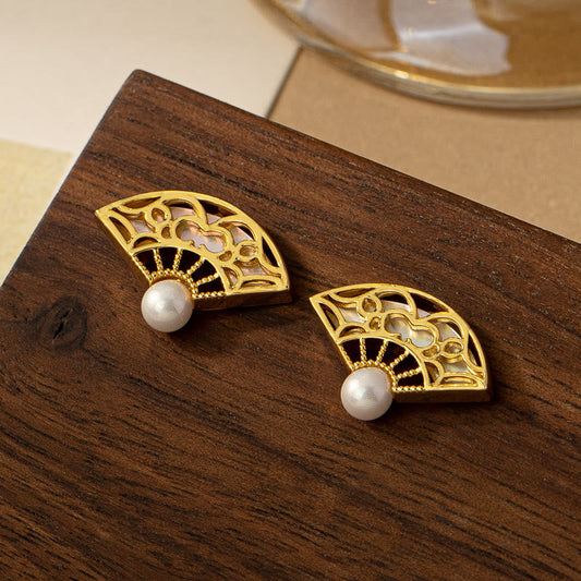 Pendientes colgantes de plata de ley 925 con diseño de abanico de postes y perlas de cobre con la sabiduría de Buddha Stones