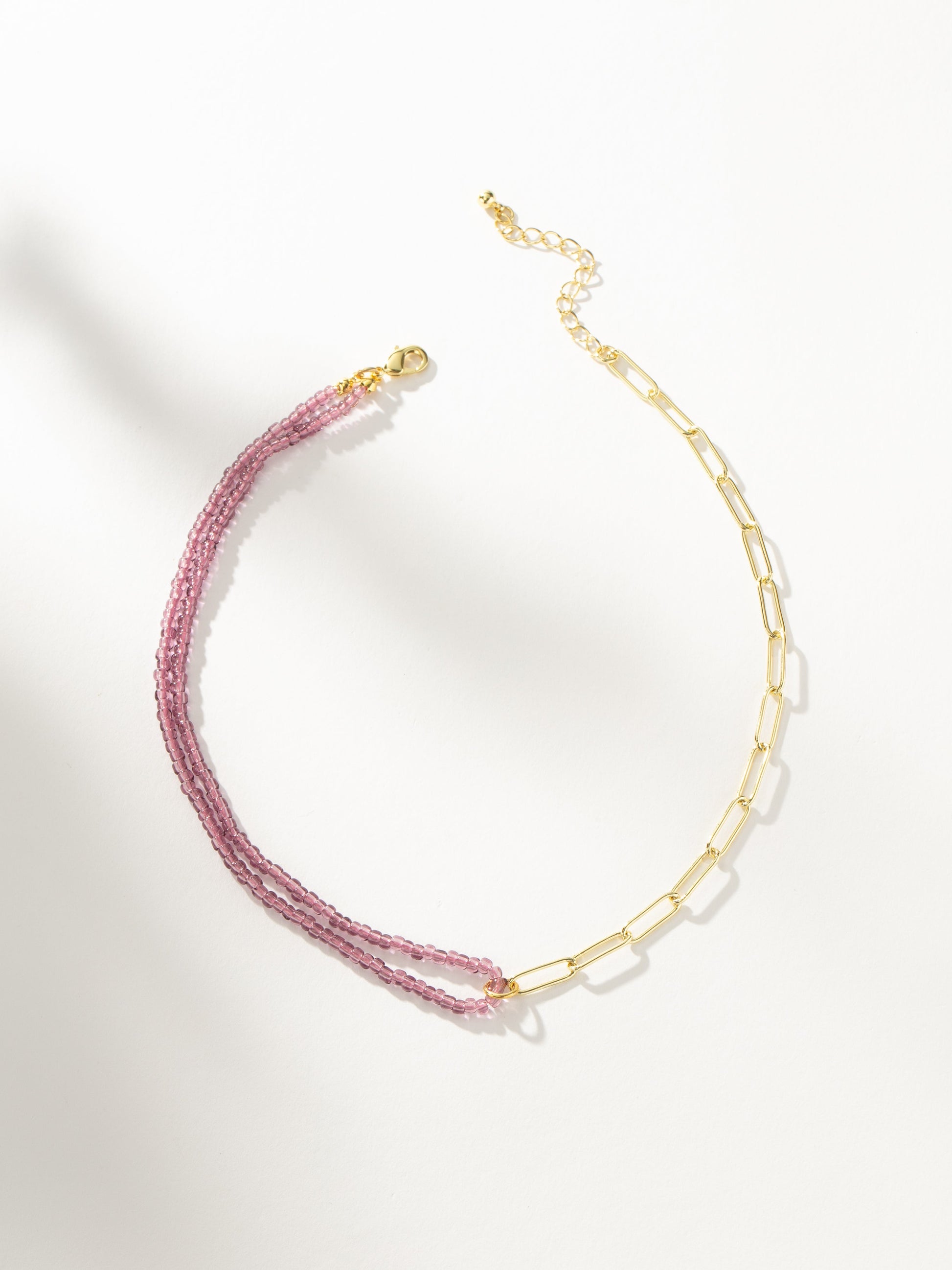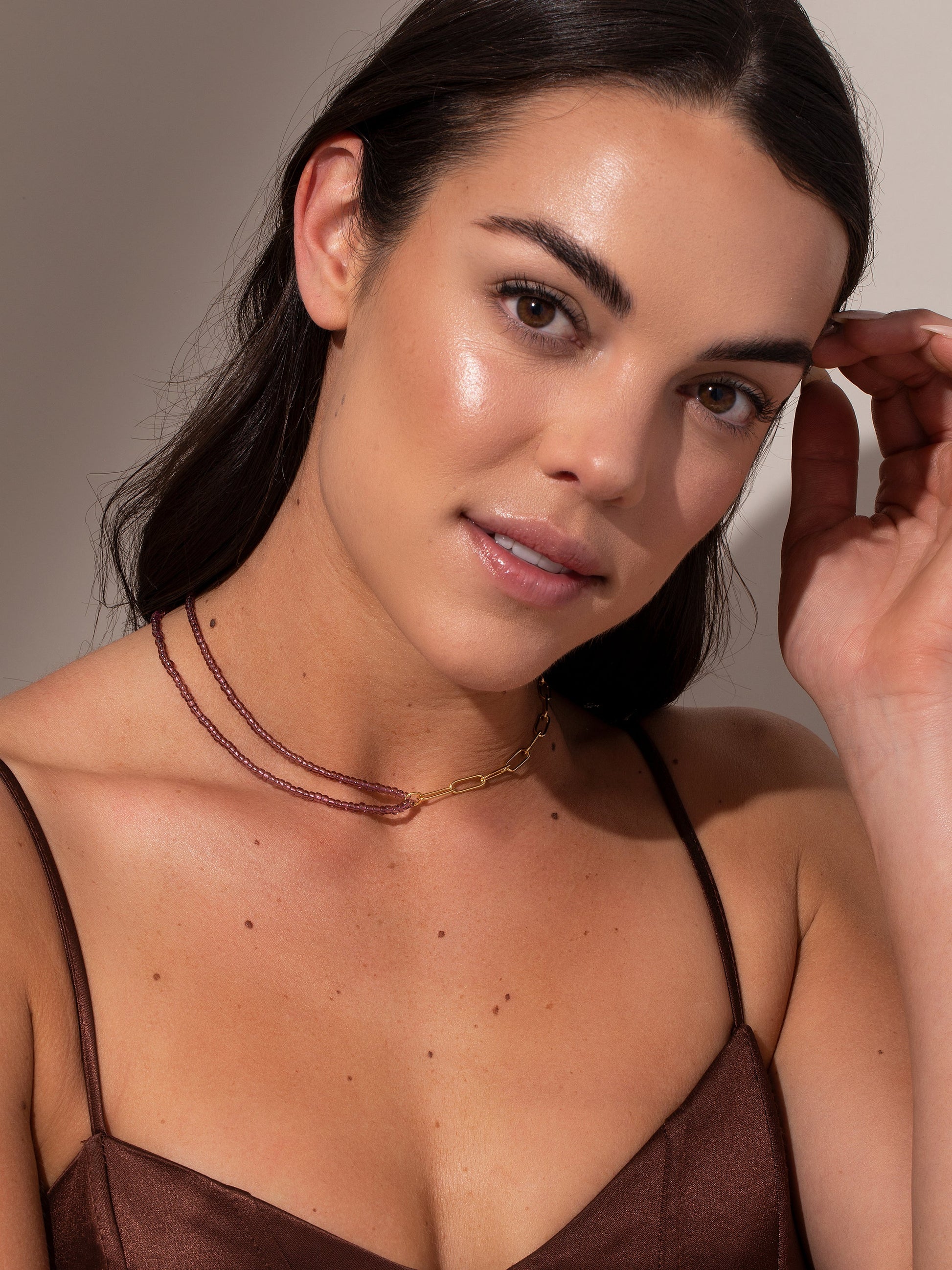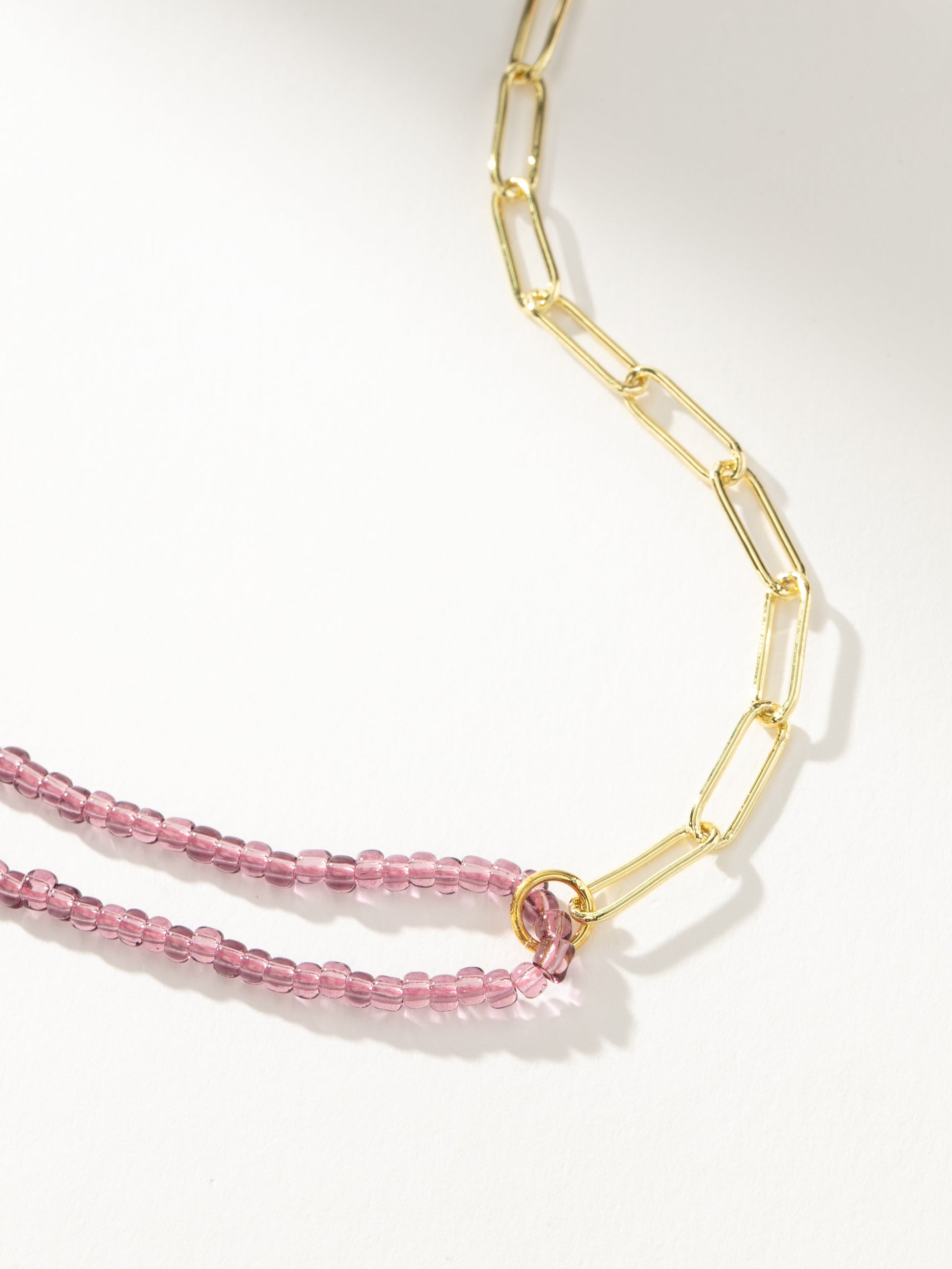 ¿Alguna vez te has preguntado qué pasa al combinar cuentas moradas con una cadena dorada de clip? Consigue nuestro collar de cuentas y cadena. Combínalo con tus demás collares de cadena para un toque de color moderno y atemporal. ¿Quieres más estilos con cuentas? Explora toda nuestra joyería de cuentas .
