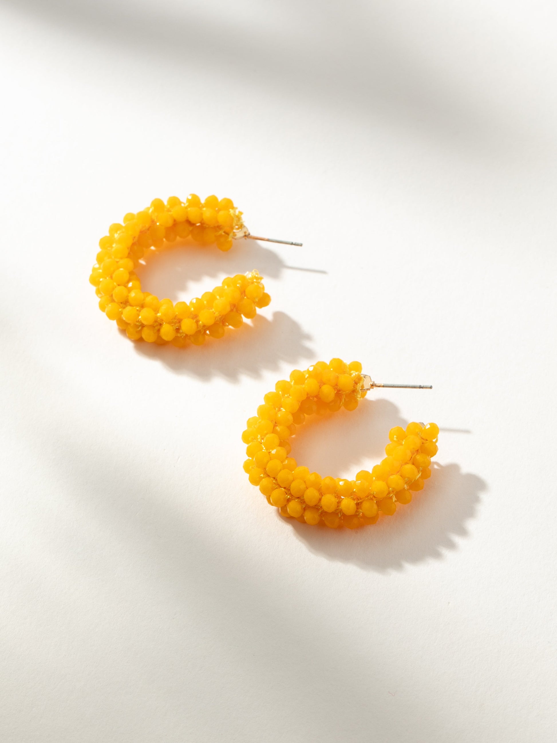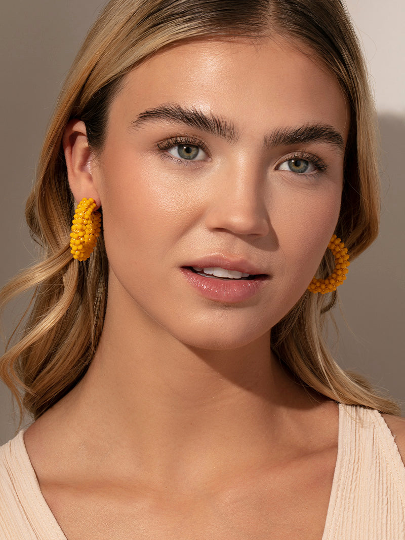 Luce un estilo único este verano con nuestros aros de cuentas. Estos pendientes de cuentas amarillo oscuro combinan a la perfección con tus pendientes dorados favoritos y con todas nuestras otras joyas de cuentas . Añade estos llamativos aros a tu colección y lucirás un look inolvidable toda la temporada.