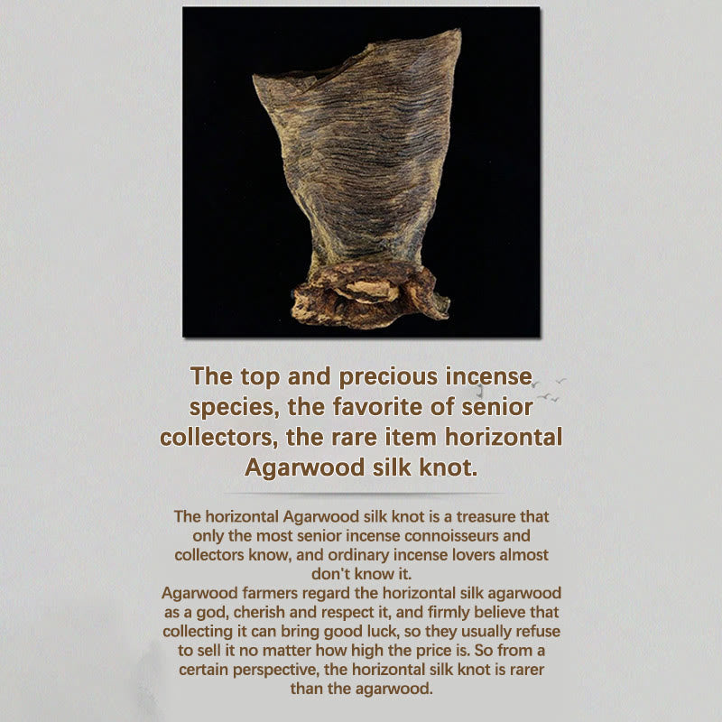Los cultivadores de madera de agar consideran la madera de agar de seda horizontal como una deidad, la aprecian y respetan, y creen firmemente que recolectarla trae buena suerte, por lo que suelen negarse a venderla, por muy alto que sea su precio. Por lo tanto, desde cierta perspectiva, el nudo de seda horizontal es más raro que la madera de agar. -