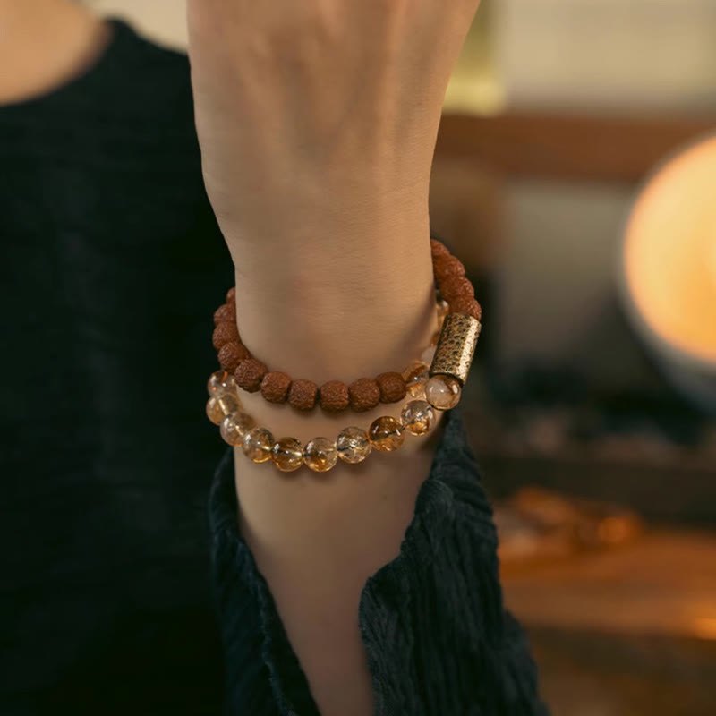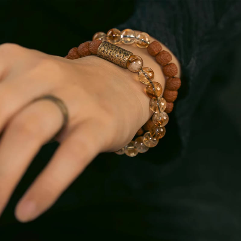 Pulsera de doble vuelta con cuentas de latón, Rudraksha, cristal de citrino natural y semillas de Bodhi de Buda