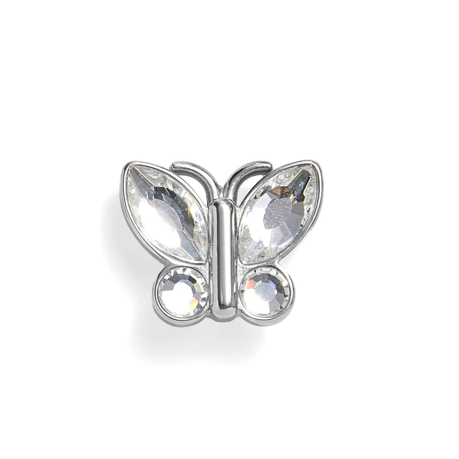 Dale un toque de elegancia a tu collar o llavero Wear Felicity con el Charm Mariposa. Este encantador diseño presenta una delicada mariposa adornada con brillantes cristales para un acabado resplandeciente. Fabricado en acero inoxidable resistente, está hecho para durar. Su cierre de rosca garantiza que se mantenga firmemente en su lugar. ¡Combínalo con nuestros otros charms de rosca para crear un collar o llavero único!