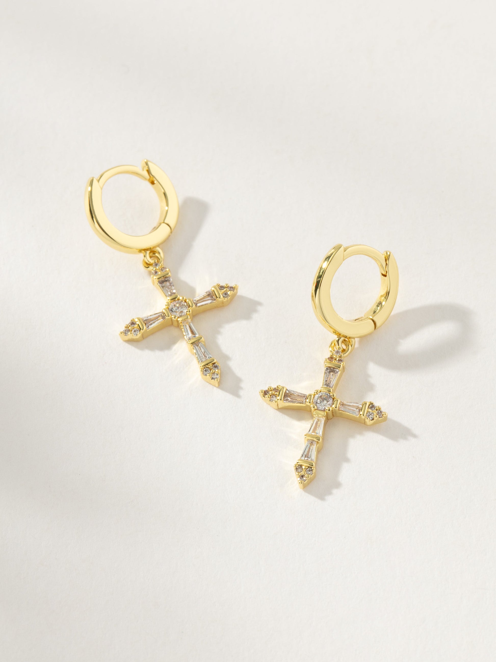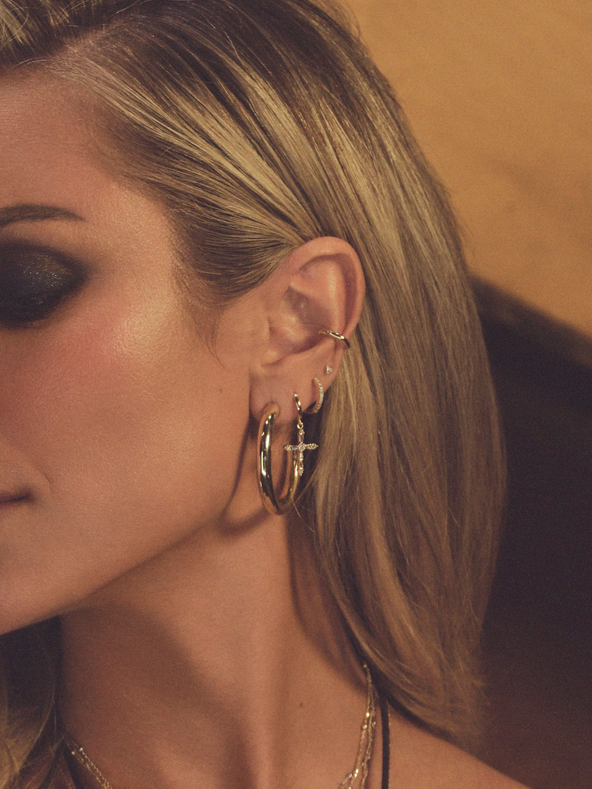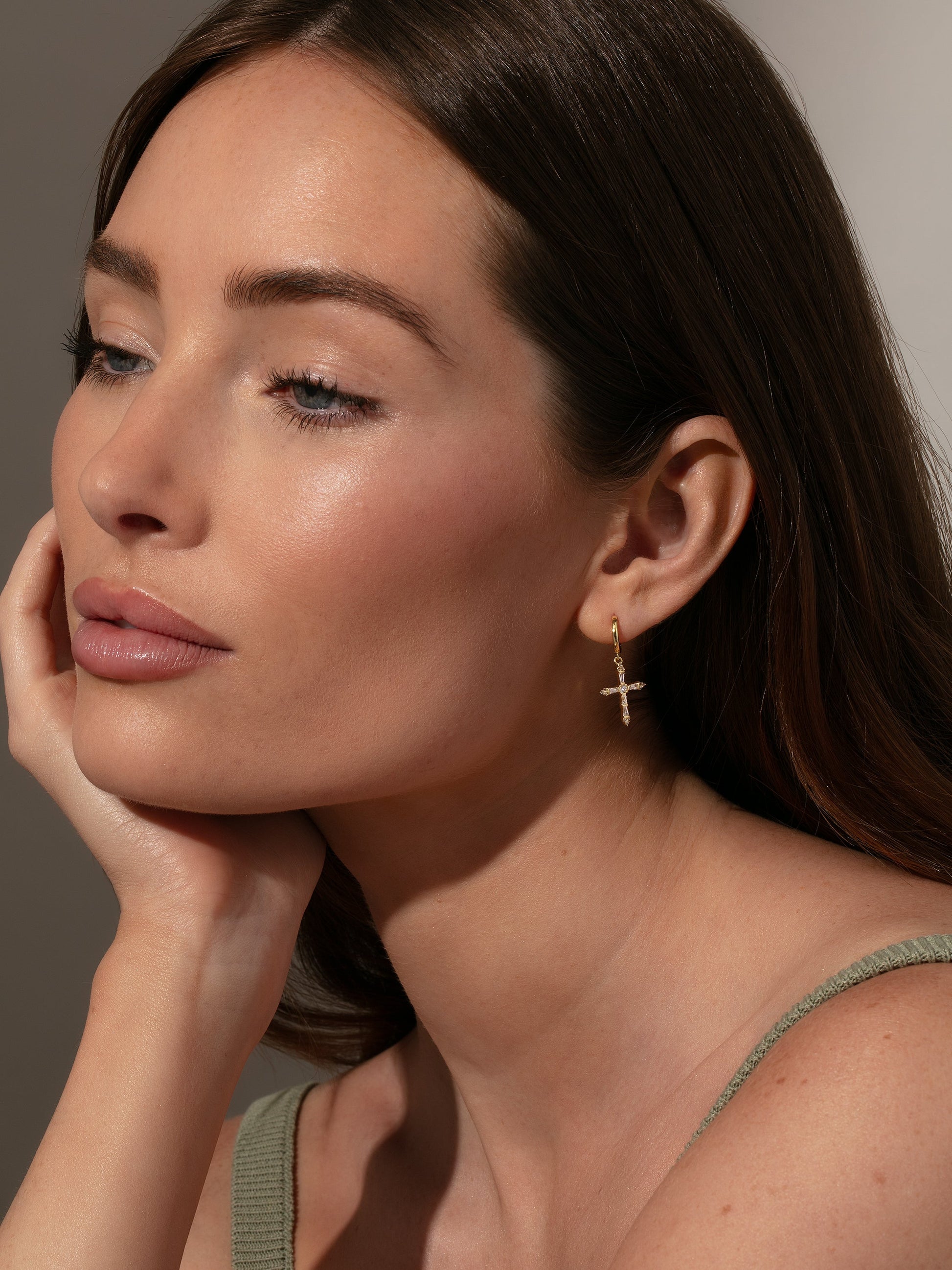 Nos encantan los momentos con joyas de cruz, y nuestros pendientes Huggie con Cruz Cristalizada añaden un toque de brillo a cualquier look. Elaborados con un miniaro dorado y una cruz colgante, estos pendientes huggie tienen un poco de todo. Para un look sutil, combina estos pendientes dorados con un sencillo pendiente de botón . Si buscas un look audaz, combina estos pendientes con un aro grande. ¿No puedes dejar de usar estilos con cruz? Necesitas todo de nuestra Colección de Joyería con Cruz .
