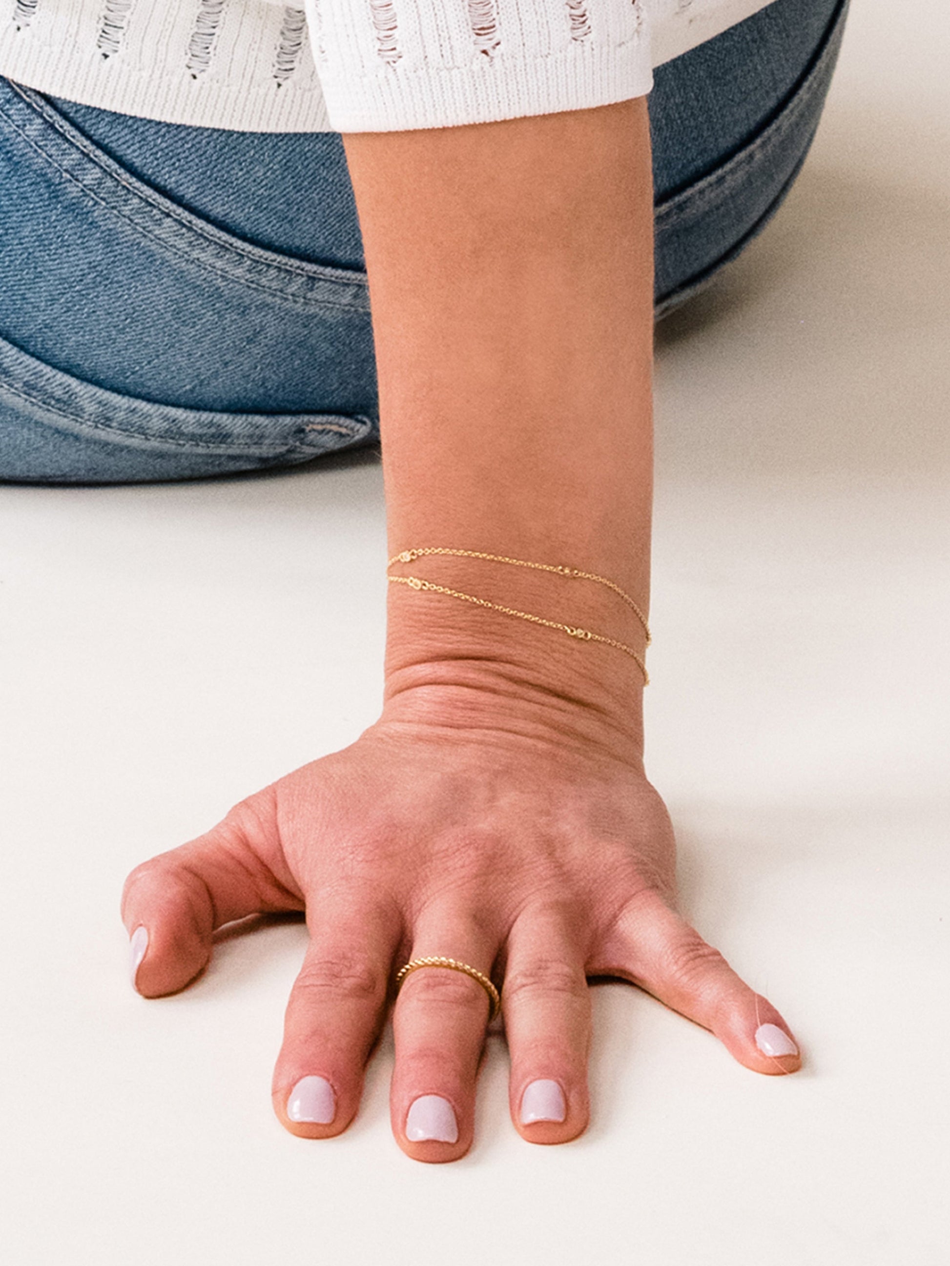 Luce un estilo delicado y sencillo con nuestra delicada pulsera de diamantes vermeil. Elaborada con oro de 18 quilates sobre plata de ley y cuatro diamantes auténticos de talla redonda ligeramente incrustados, esta pulsera de oro es perfecta para el día a día. Para recrear el look de Kristin, combina esta delicada pulsera de cadena con nuestro anillo de vermeil Simple Life .