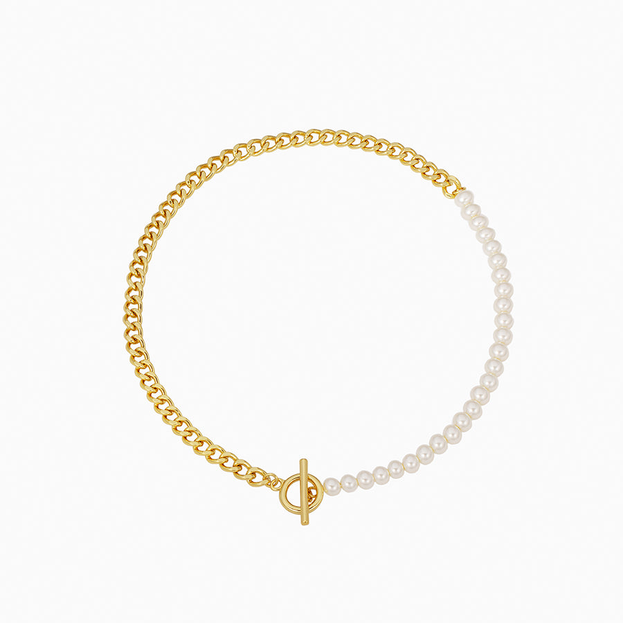 ¿Buscas un estilo atemporal o moderno? Nuestro collar Double Standard te ofrece ambas opciones. Mitad cadena barbada bañada en oro, mitad perlas artificiales y un llamativo cierre de barra en T: este collar de oro y perlas es imprescindible. Para un look completo, combínalo con pendientes de oro y perlas.