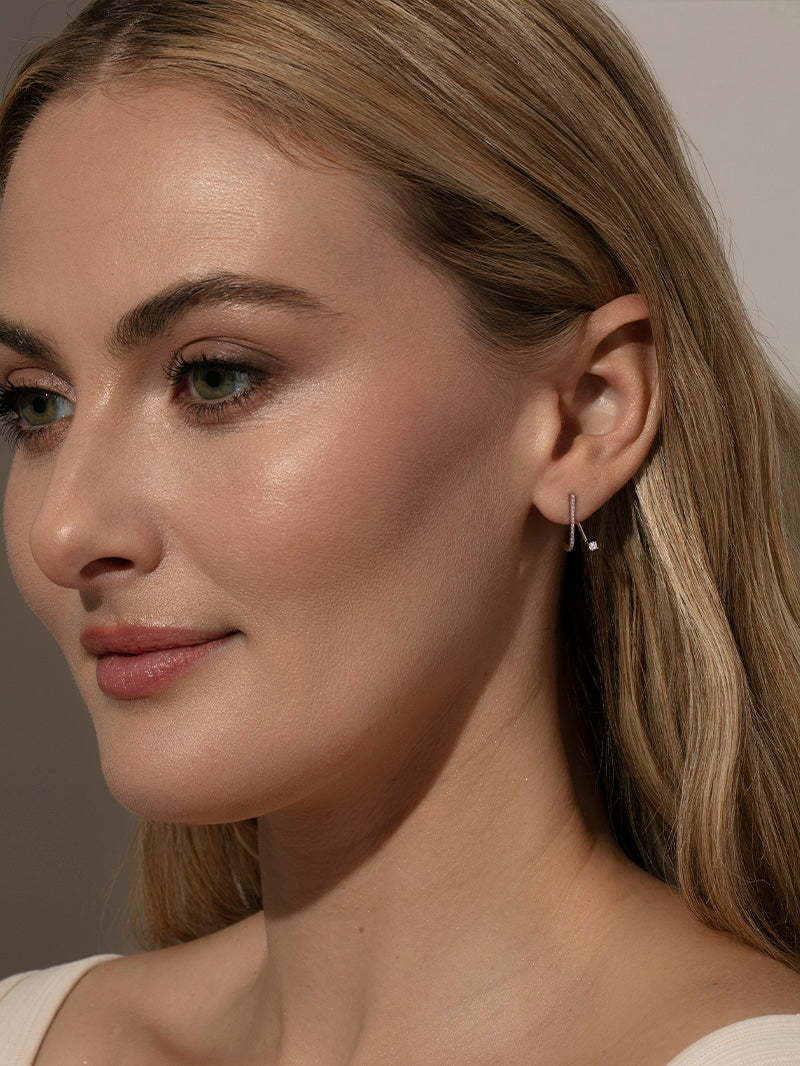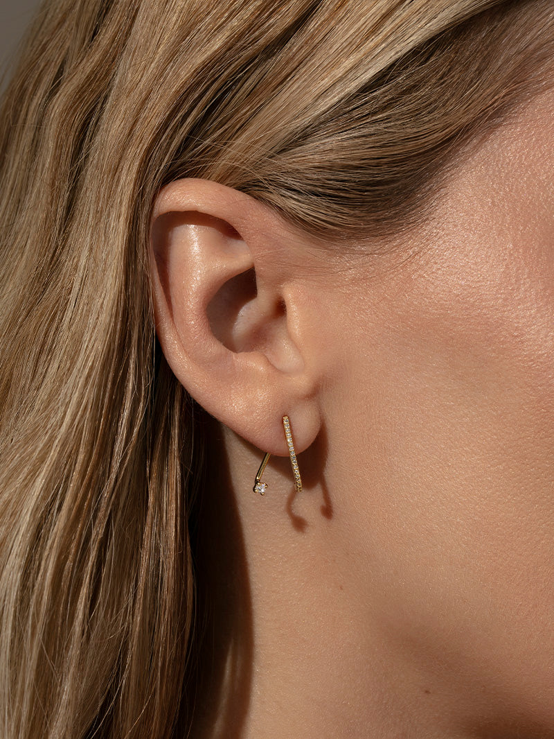 Luce el estilo perfecto con nuestros pendientes Eyes on Me Ear Jacket. Estos pendientes únicos tienen una caída frontal y trasera que le dan un toque de brillo extra a tu conjunto. En la parte trasera, una barra de oro desciende por debajo del lóbulo, dejando ver una circonita cúbica. En la parte frontal, una barra de pavé de oro añade aún más brillo. Para un look completo, combina estos pendientes ear jacket con cualquier pieza de nuestra colección Just Add Sparkle .