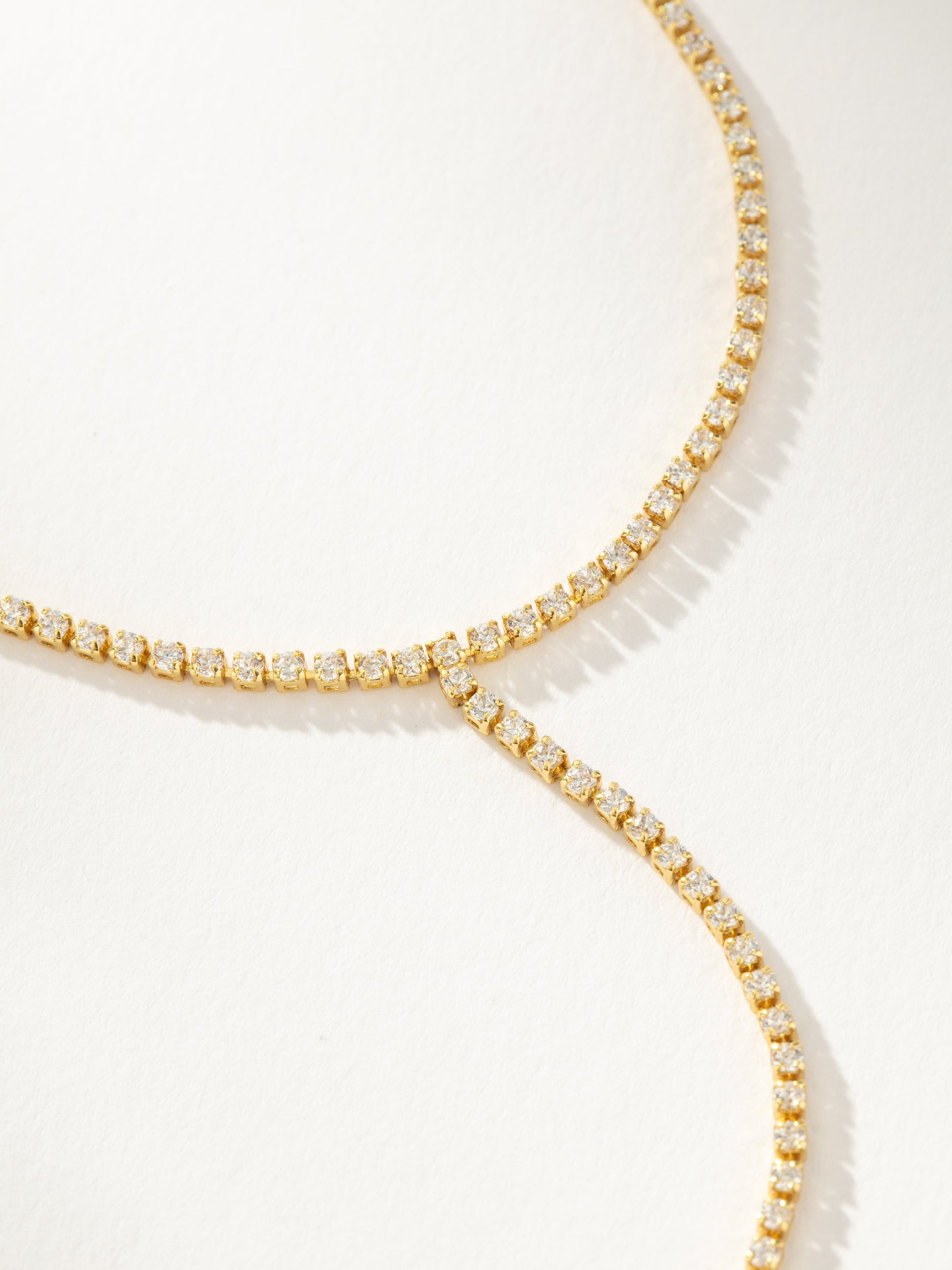 Como nos encantan los collares de lazo, pensamos en crear un collar de lazo de tenis. Nuestro collar de lazo Glam está elaborado con una sola hilera de circonitas cúbicas, engastada en un collar en forma de Y. Para un look completo, combina este collar de tenis con nuestra pulsera de tenis Glam .