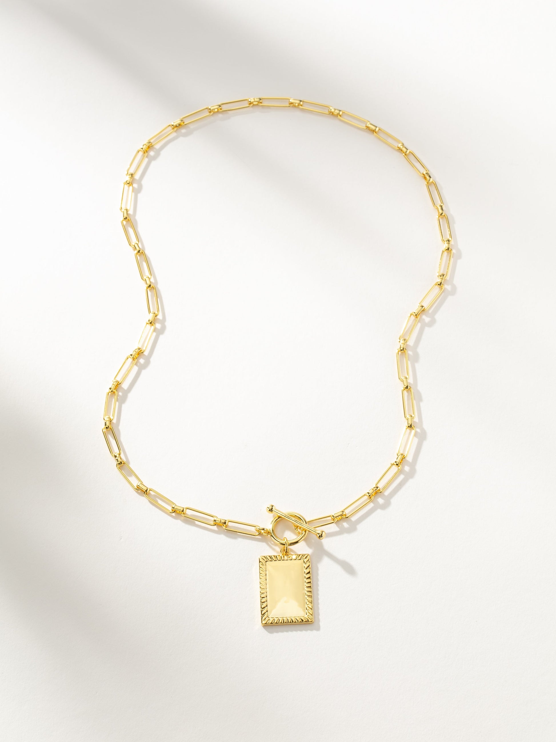 Elaborado con una cadena de clip, un cierre de palanca y un llamativo colgante rectangular, nuestro Glorious Necklace es el collar llamativo que todos necesitan. Casi omitimos lo mejor de este collar de cadena y colgante: ¡puedes grabarlo! Personaliza este collar grabable añadiendo un personaje.