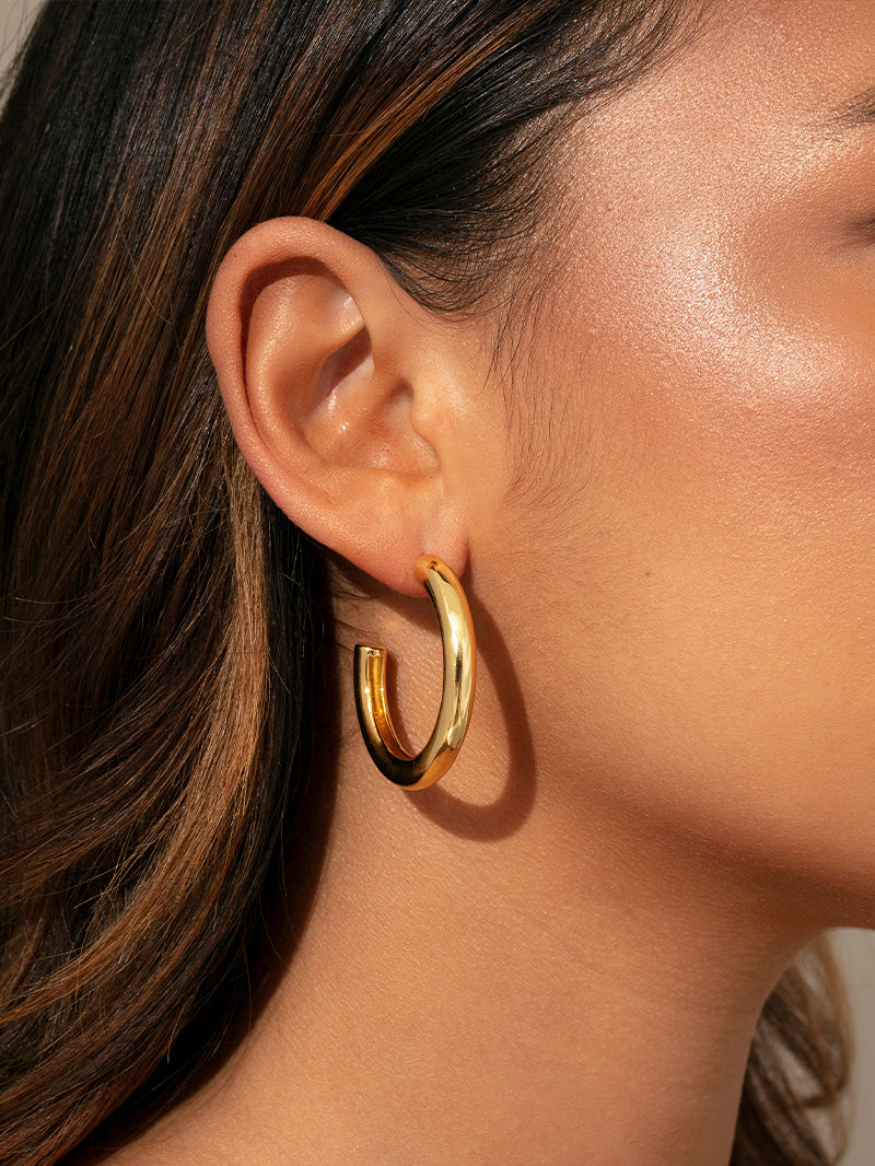 Nuestros aros tubulares Leading Role están listos para ser el centro de atención. Estos aros gruesos se convertirán inmediatamente en tus nuevos pendientes de diario, con infinitas opciones de estilo. Para un conjunto completo de aros dorados, combínalos con nuestros aros Attitude .