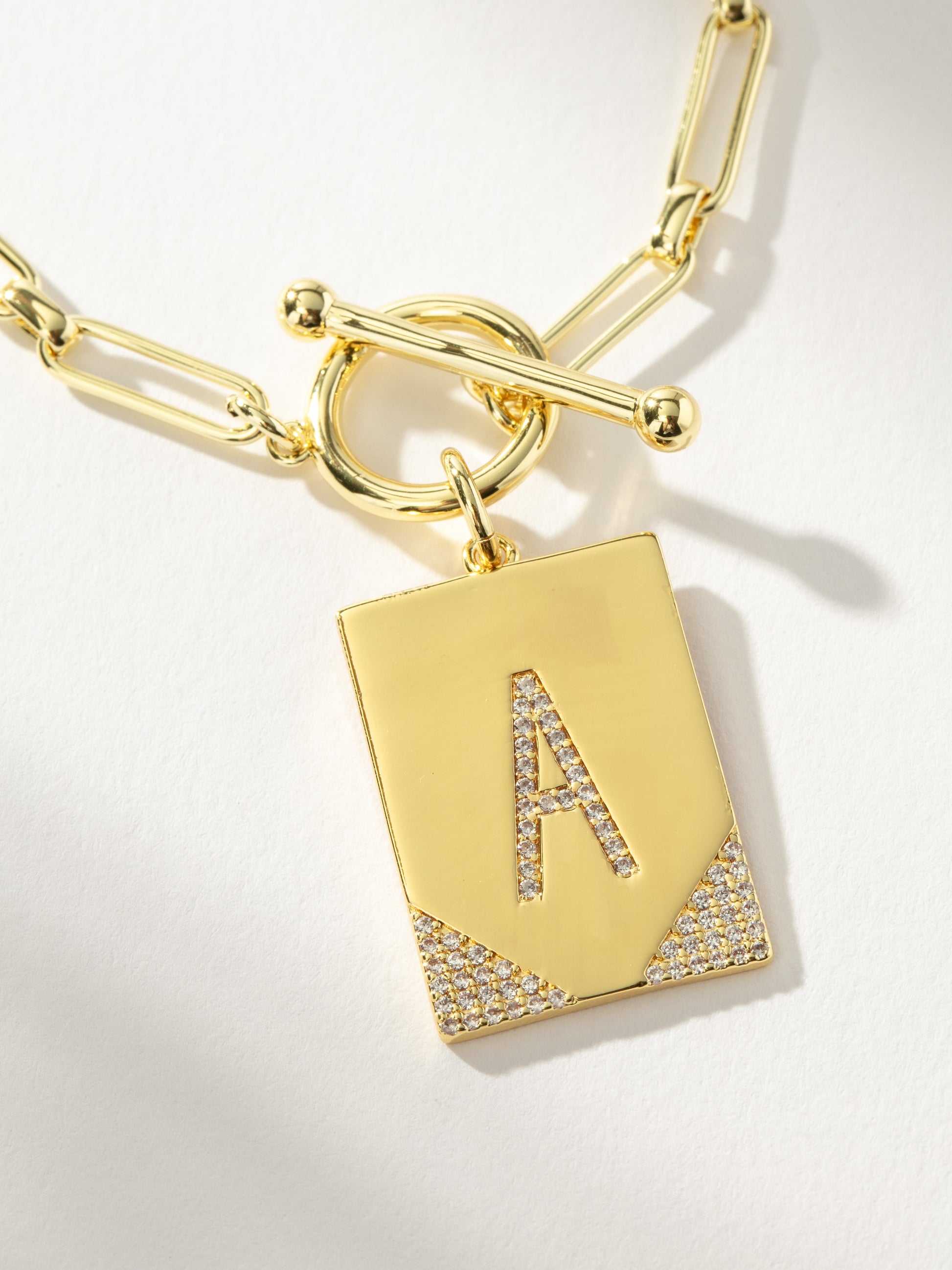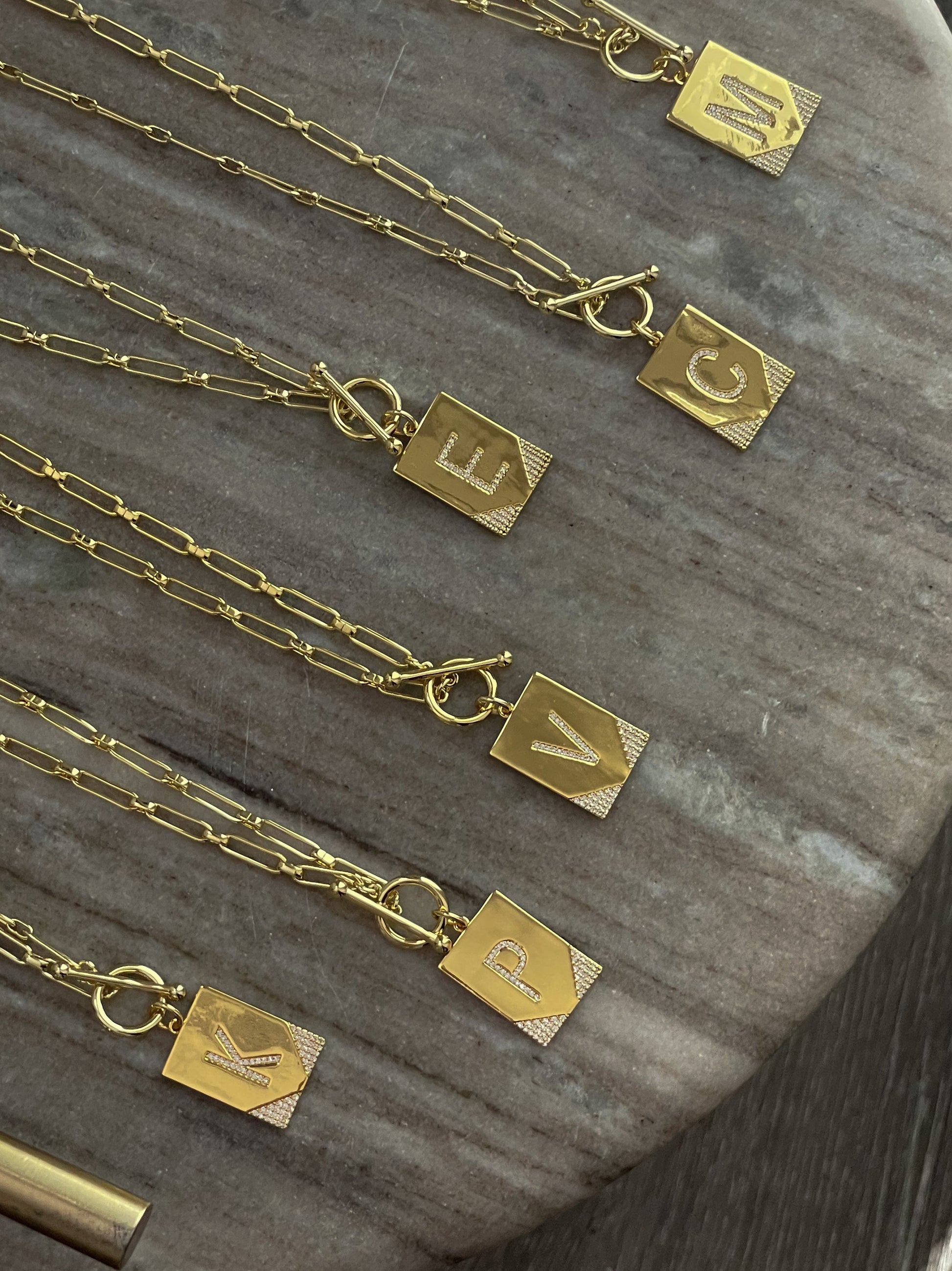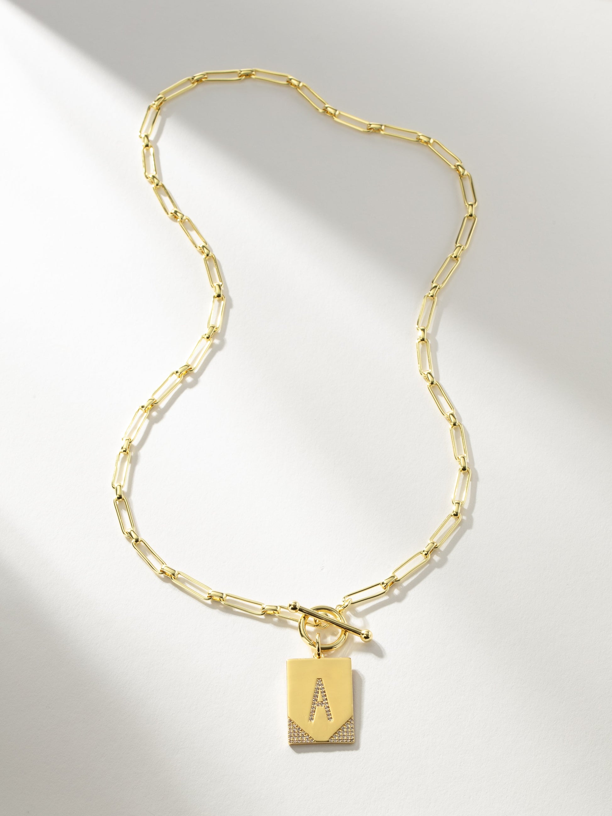 Ningún collar con inicial deja huella como nuestro collar de cadena "Deja tu huella". Con una cadena de clip, un cierre de palanca y un colgante rectangular, nadie te olvidará con este collar.