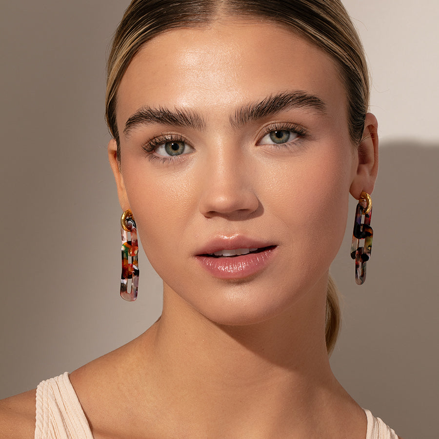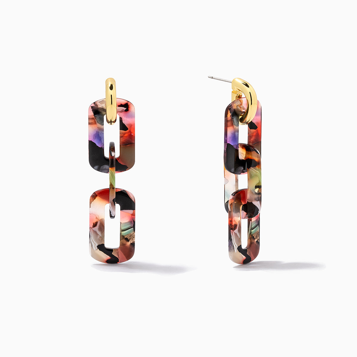 Estos pendientes de resina combinan con todo. Elaborados con un aro dorado y una cadena de tres eslabones, estos pendientes llamativos son justo lo que necesitas. Combínalos con tus pendientes dorados favoritos o con nuestros pendientes de resina con forma de corazón. Ten en cuenta que cada par es único y tiene su propio diseño de resina.
