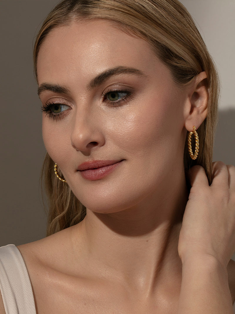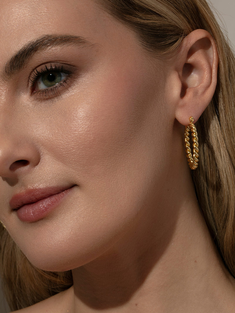 Realza tus aros de diario con nuestros aretes de aro con diseño de cuerda. Disponibles en plata y oro, estos aros gruesos combinan a la perfección con tus aretes huggie , aretes de botón o cualquier otro accesorio de tu colección. ¿Quieres añadir más aros llamativos a tu colección? Explora todos nuestros aretes llamativos .