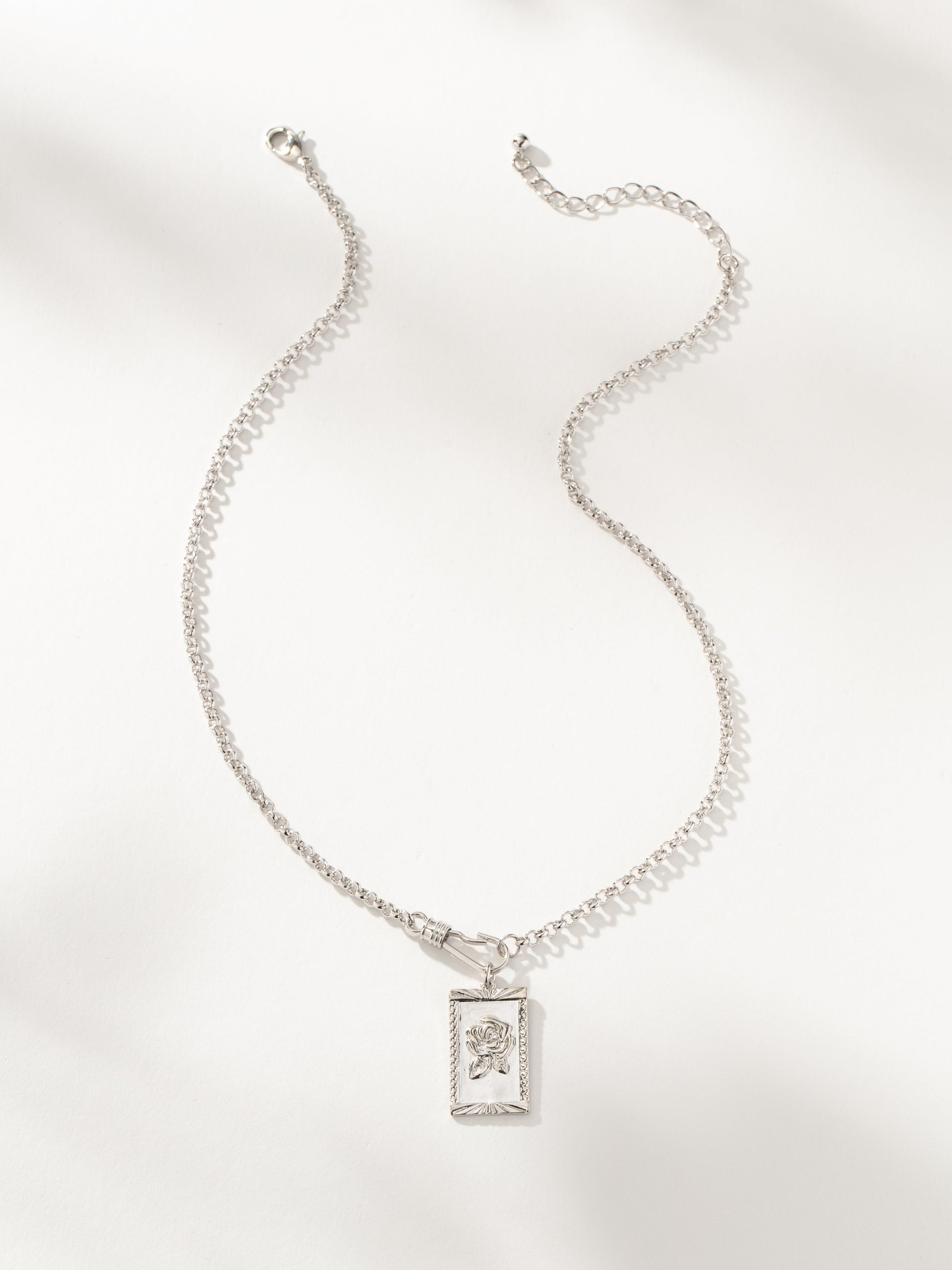 Muestra tu lado dulce con nuestro collar con colgante Rosy. Elaborado con una cadena, un gran colgante rectangular, un diseño de rosa y un cierre frontal único, esta cadena y collar lo tienen todo. Para un look completo, combina este collar de rosas con tu collar delicado favorito. ¿Quieres más estilos de joyería con rosas? Descubre nuestra colección In The Garden .