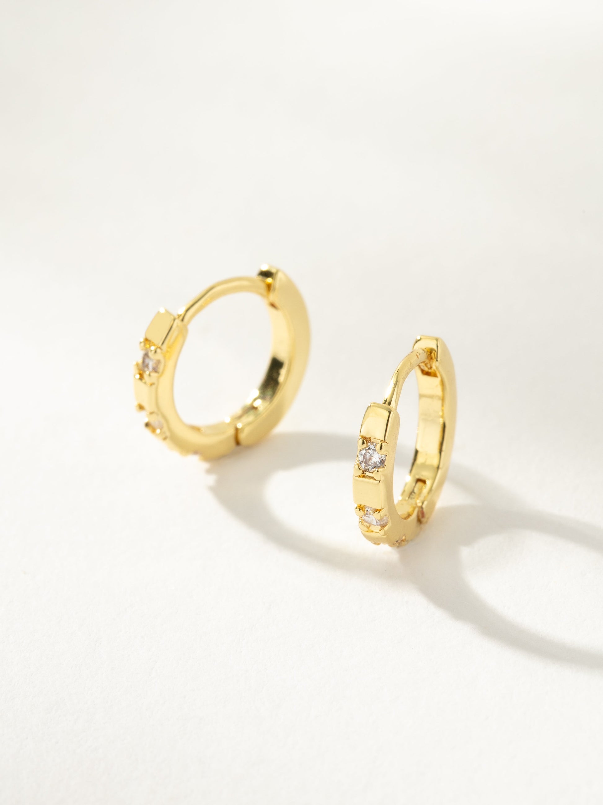 Lleva tu colección de pendientes a otro nivel con nuestros pendientes Runway Huggie. Estos mini aros dorados, aunque pequeños, le dan un toque de detalle. Con un diseño de cuadrados y gemas, estos pendientes huggie dorados serán el centro de atención. Para un look digno de una pasarela, combínalos con nuestros pendientes ovalados Huggie .