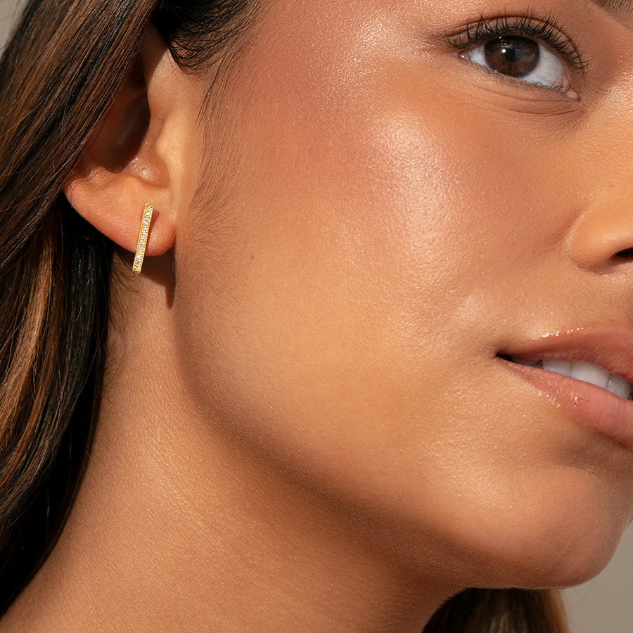 Nuestros Huggies Vixen le darán un toque atrevido a tu look. Estos aretes en forma de V con pavé en la parte delantera se pueden usar fácilmente solos o como parte de tu colección de aretes de diario.