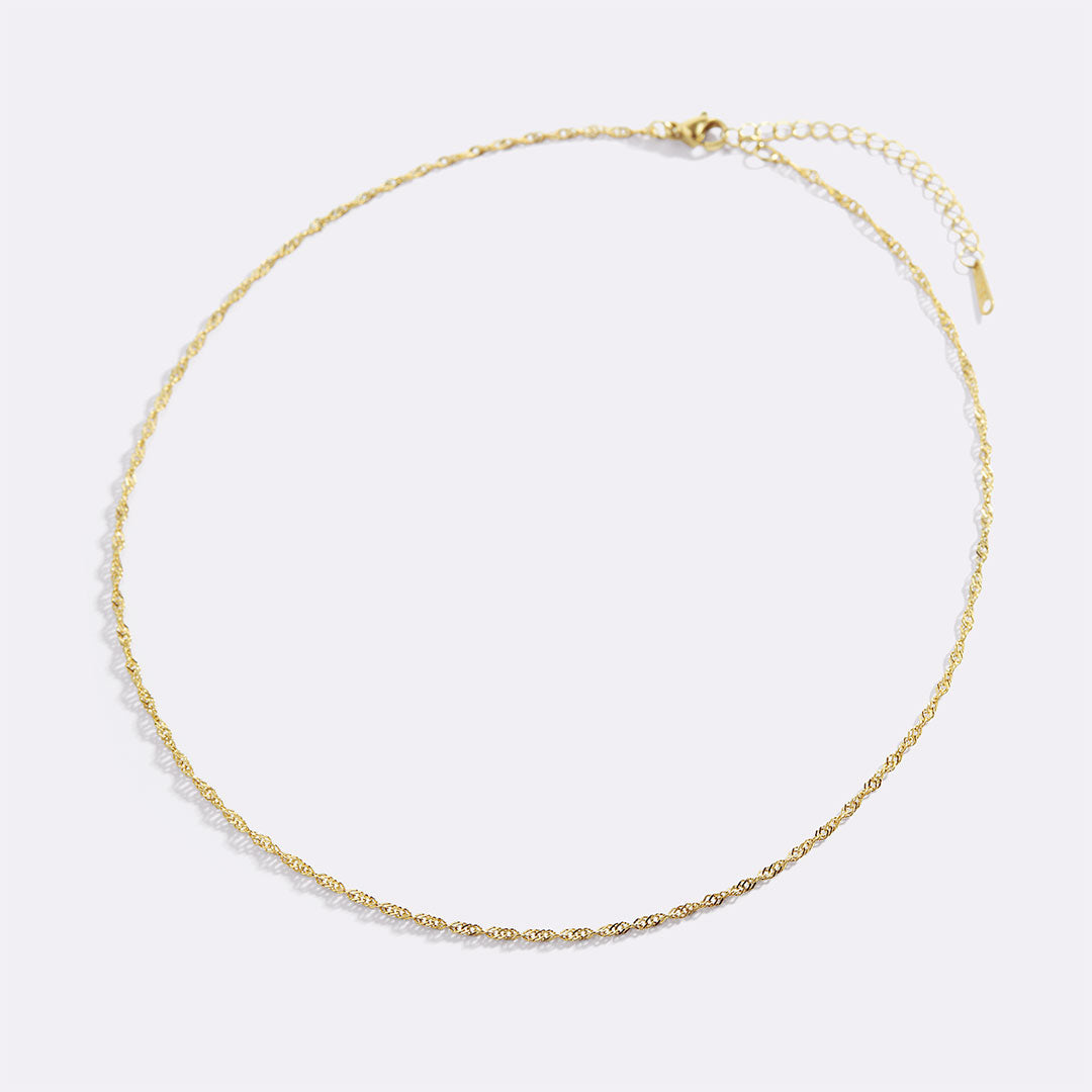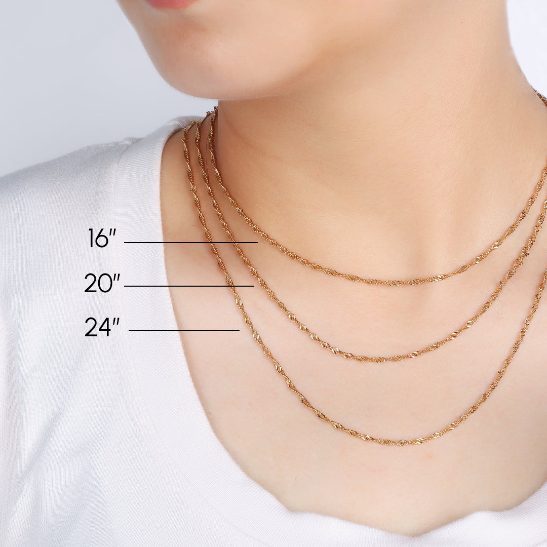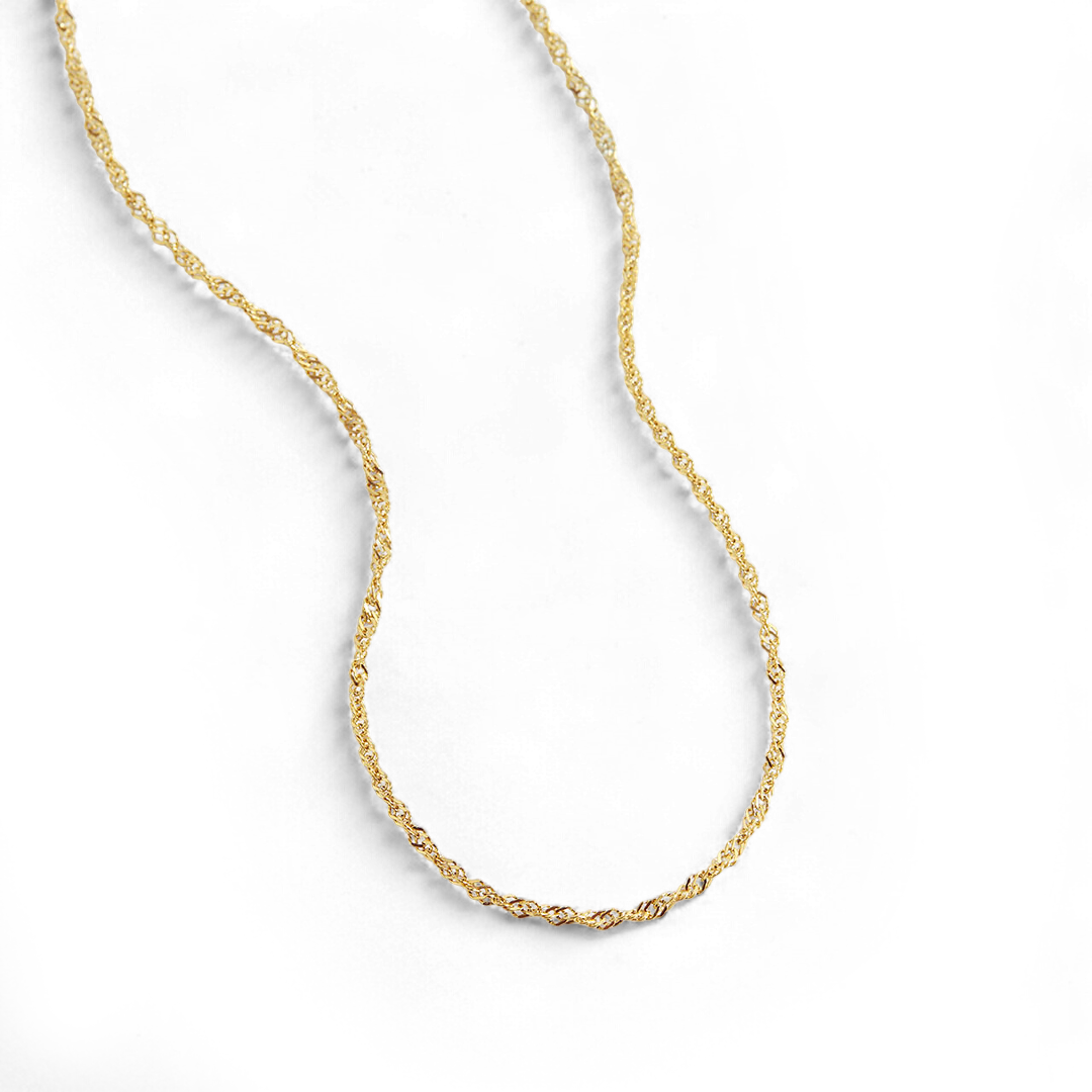 Sleek and sophisticated, this 2mm Singapore Twist Chain Necklace adds a touch of effortless elegance. Its intricate twist design catches the light beautifully, making it perfect for layering or wearing solo.