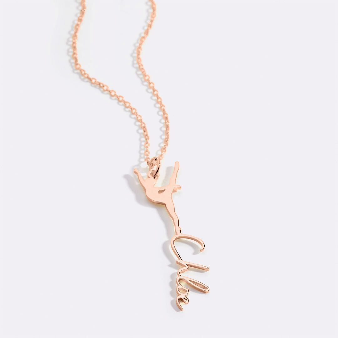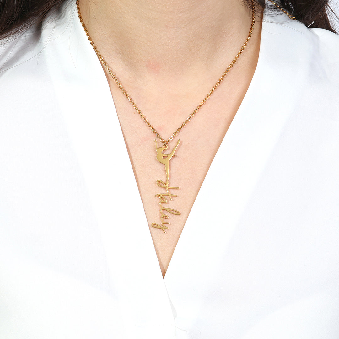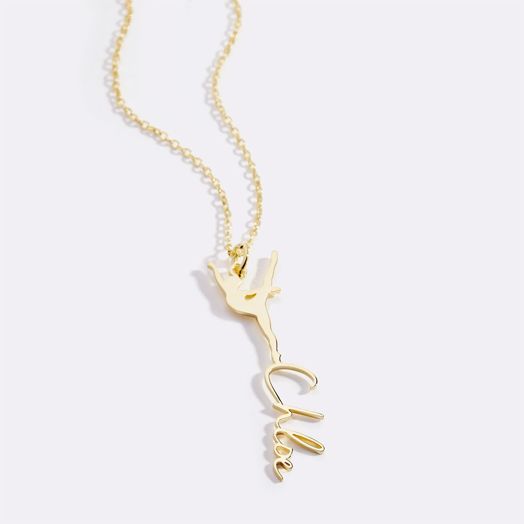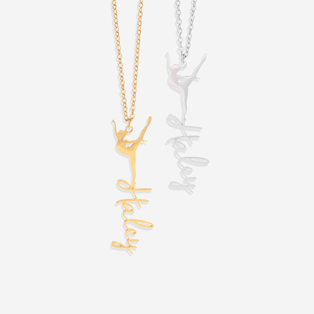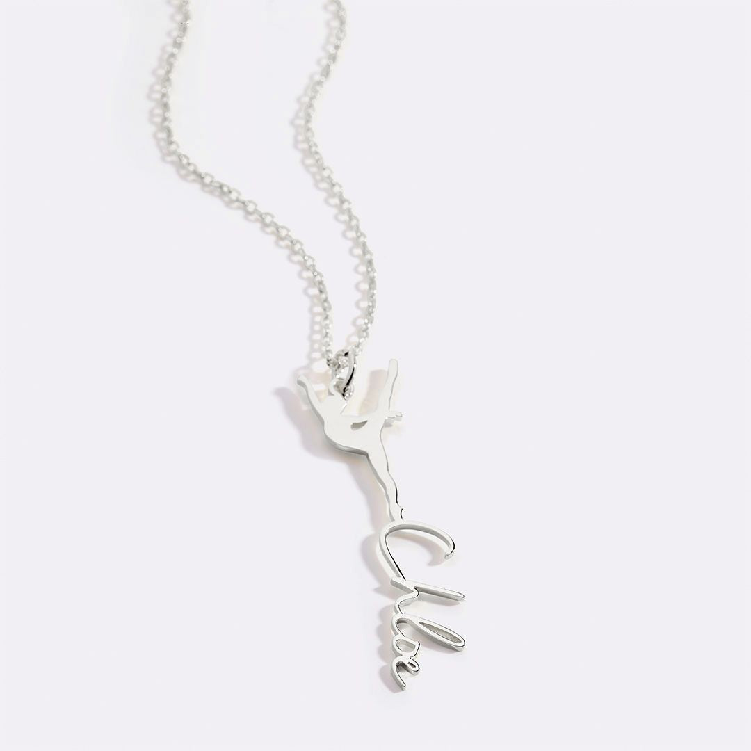 Inspired by the beauty of motion, this dance-inspired name pendant is perfect for those who express themselves through movement. With its flowing script and lightweight design, this necklace is a stunning tribute to the artistry and grace of dance.