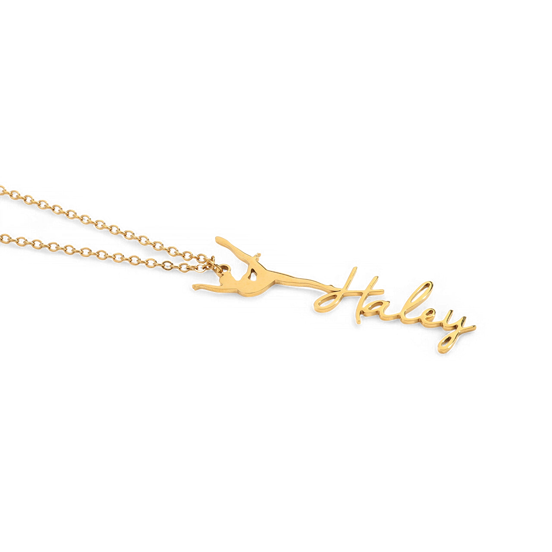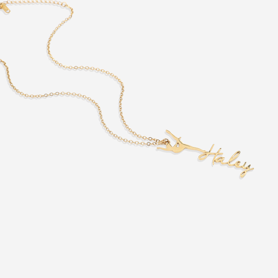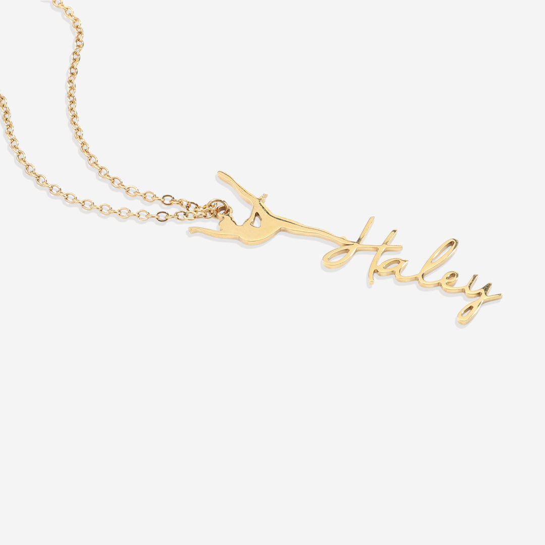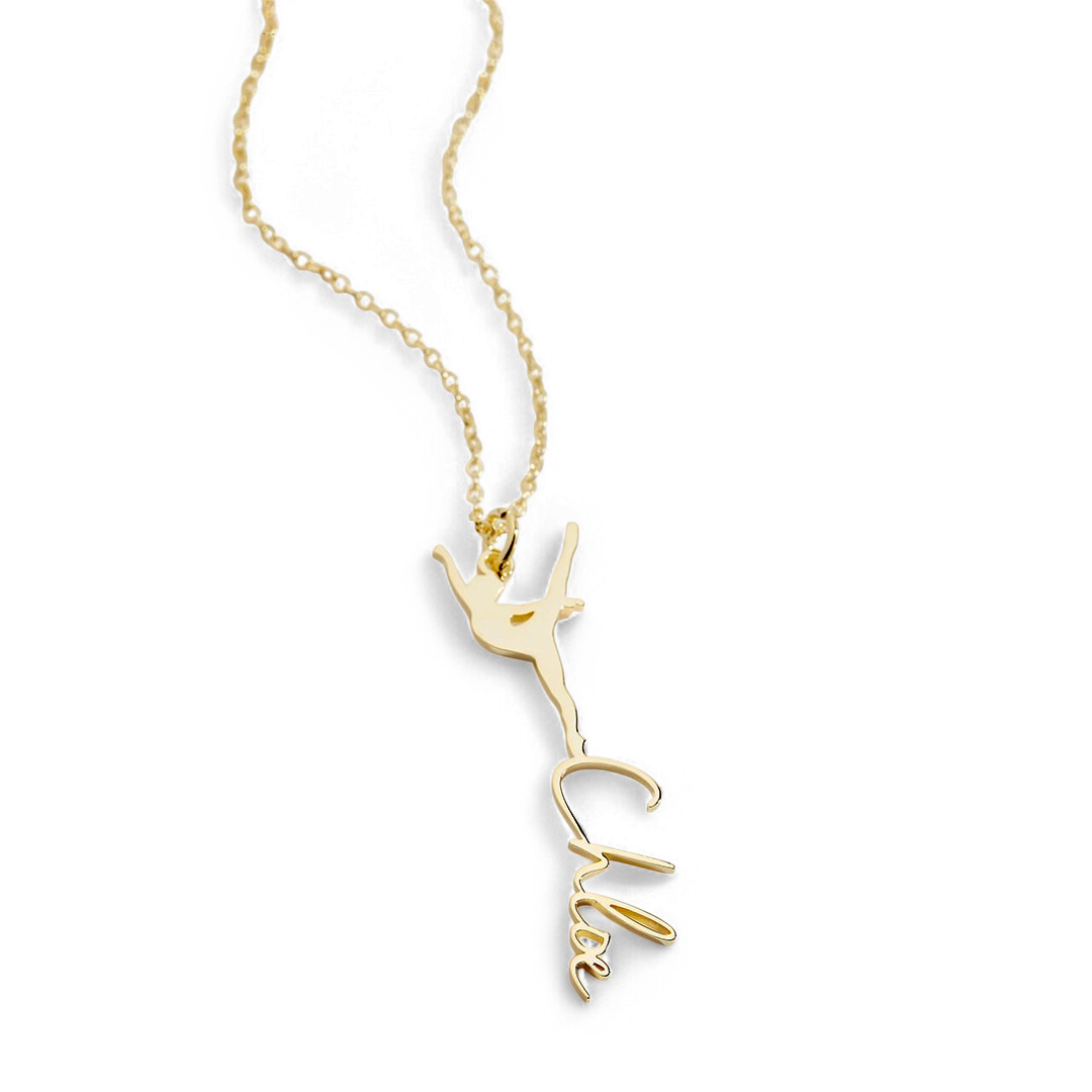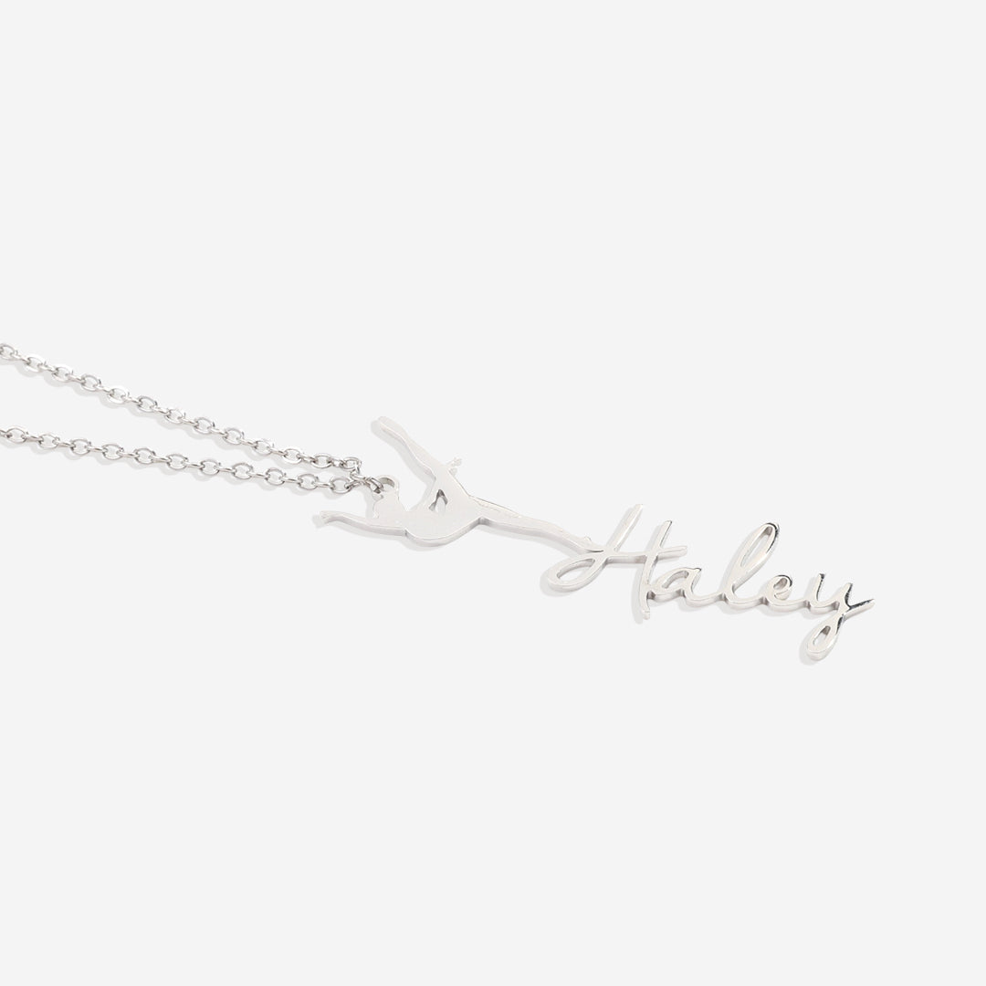 Inspired by the beauty of motion, this dance-inspired name pendant is perfect for those who express themselves through movement. With its flowing script and lightweight design, this necklace is a stunning tribute to the artistry and grace of dance.