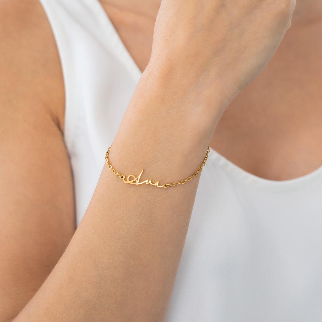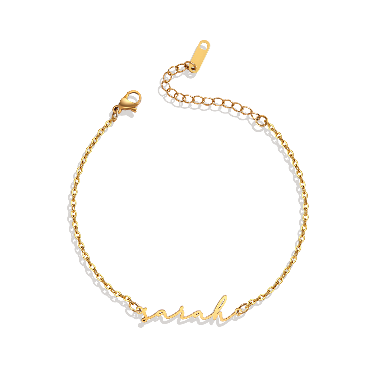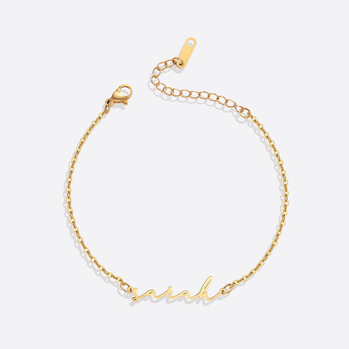 This graceful piece features your name in a delicate, flowing script font, creating a personalized and sophisticated accessory. Ideal for everyday wear or as a bespoke gift, this bracelet adds a subtle yet stunning personal touch to any ensemble.