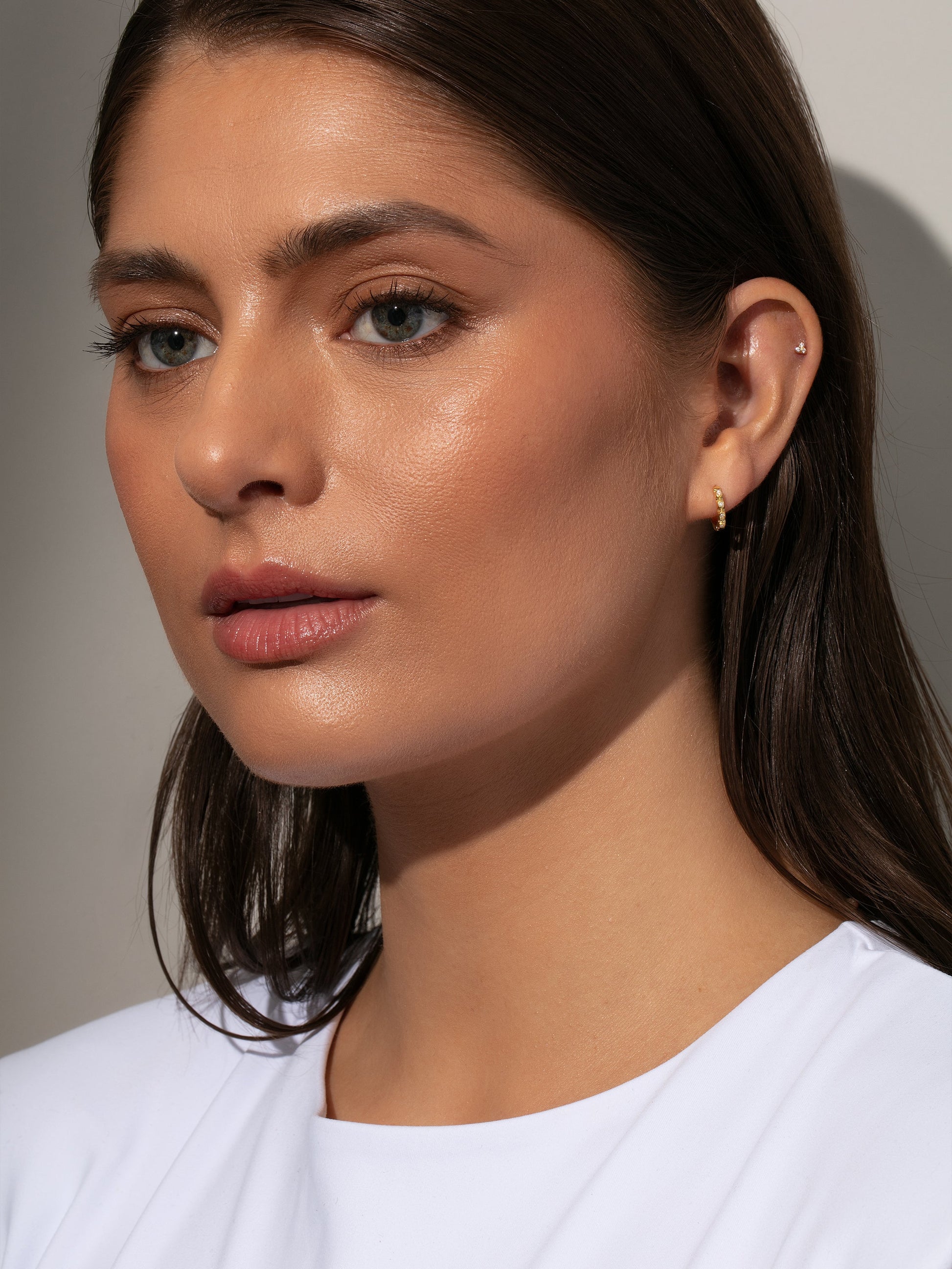 Add some minimal glam to your ear stack with our Diamond Pavé Vermeil Huggies. Crafted from 18k gold over sterling silver, these huggie earrings feature real, slightly included round-cut diamonds on the front and back. For a full ear stack, pair these small gold hoops with our Bold Vermeil Hoop Earrings.