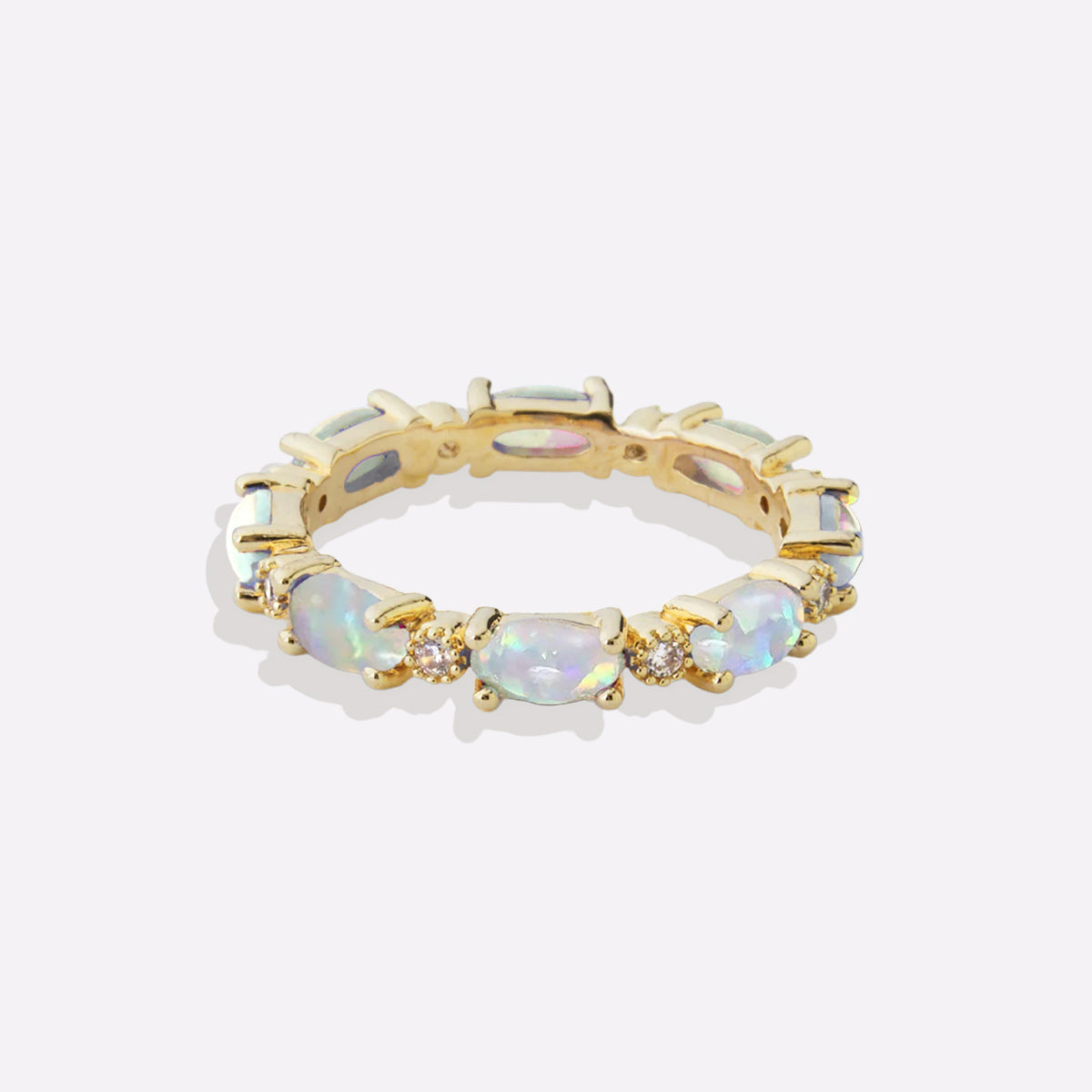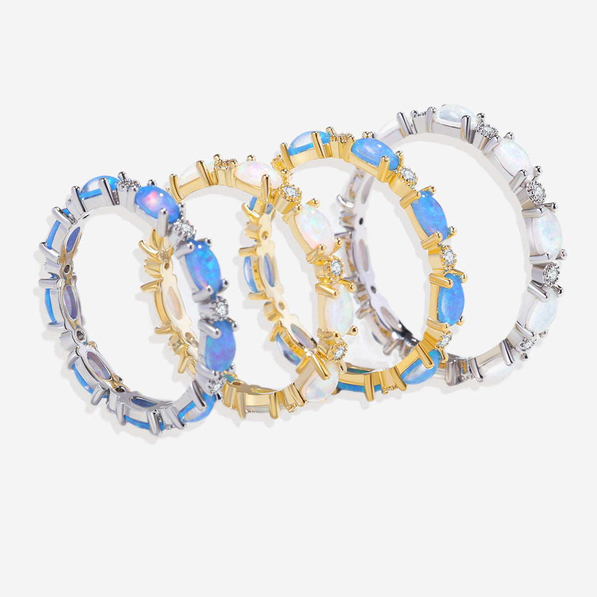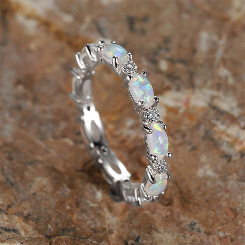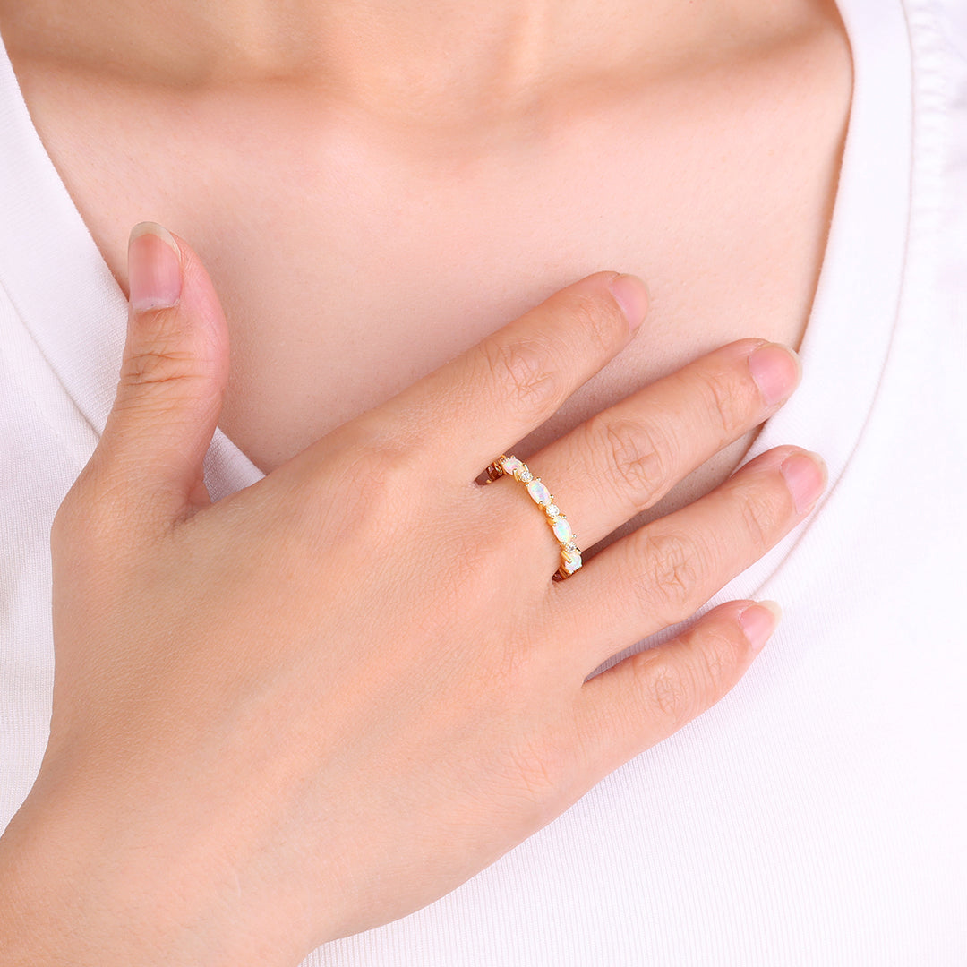 This stunning ring features a continuous circle of brilliantly colored fire opals, symbolizing everlasting love and passion. Perfect for those seeking a bold statement piece or a meaningful anniversary gift.