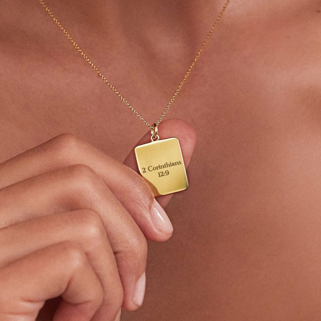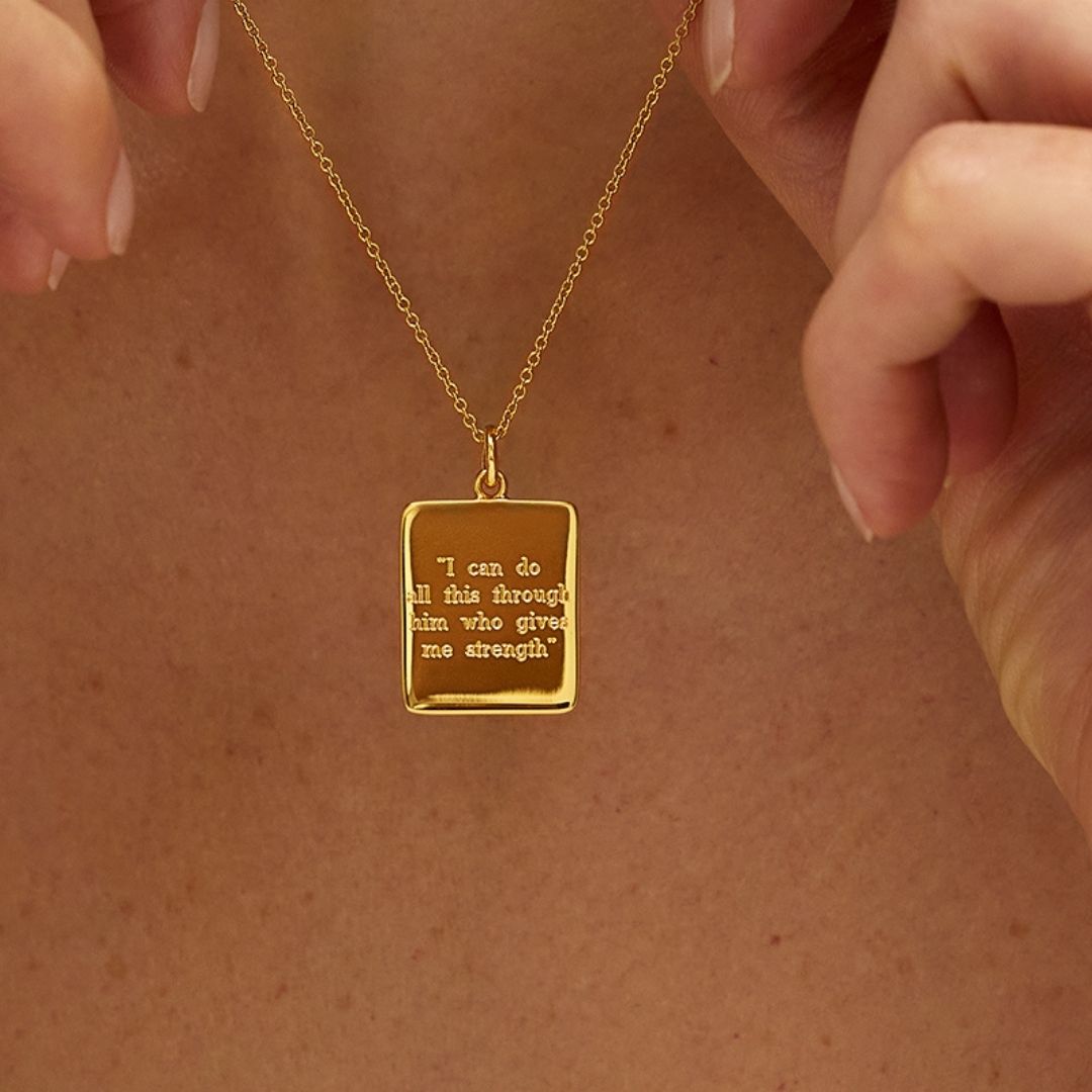 This Gold Personalised Verse Necklace is a beautifully crafted piece that allows you to choose any words or messages to be precision engraved. Made with 925 sterling silver and plated in 14ct gold, this necklace offers a unique and personal touch to your everyday style.