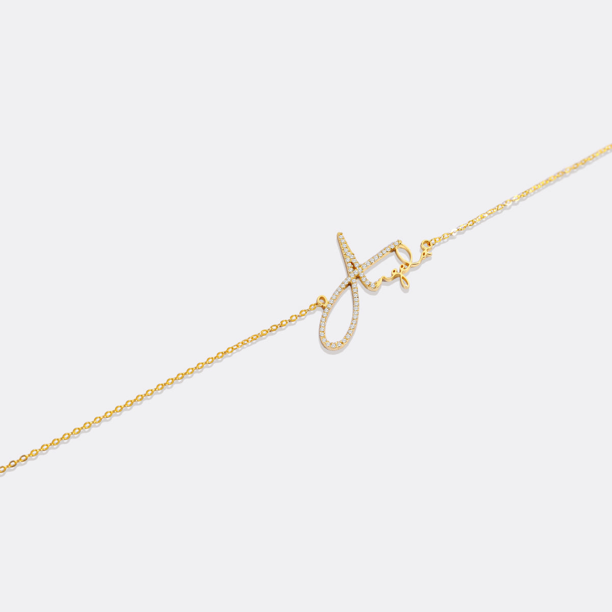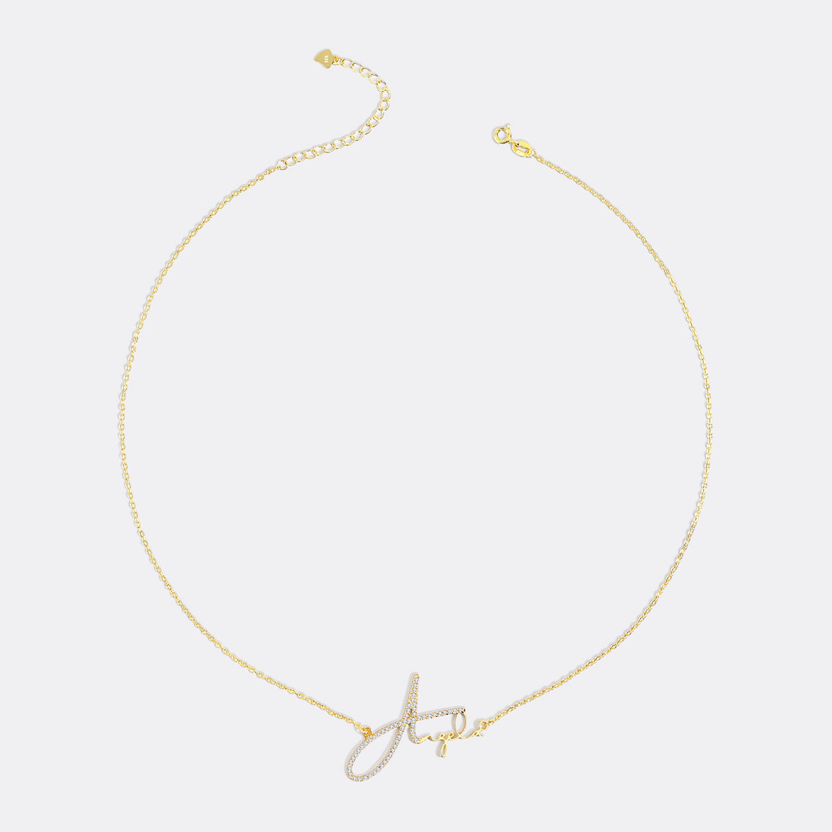 Mint & Lily's Luxe Name Necklace elevates personalized jewelry with a touch of glamour. This exquisite necklace features your custom word or name in elegant script, with the first initial highlighted by sparkling cubic zirconia (CZ) stones for added brilliance.