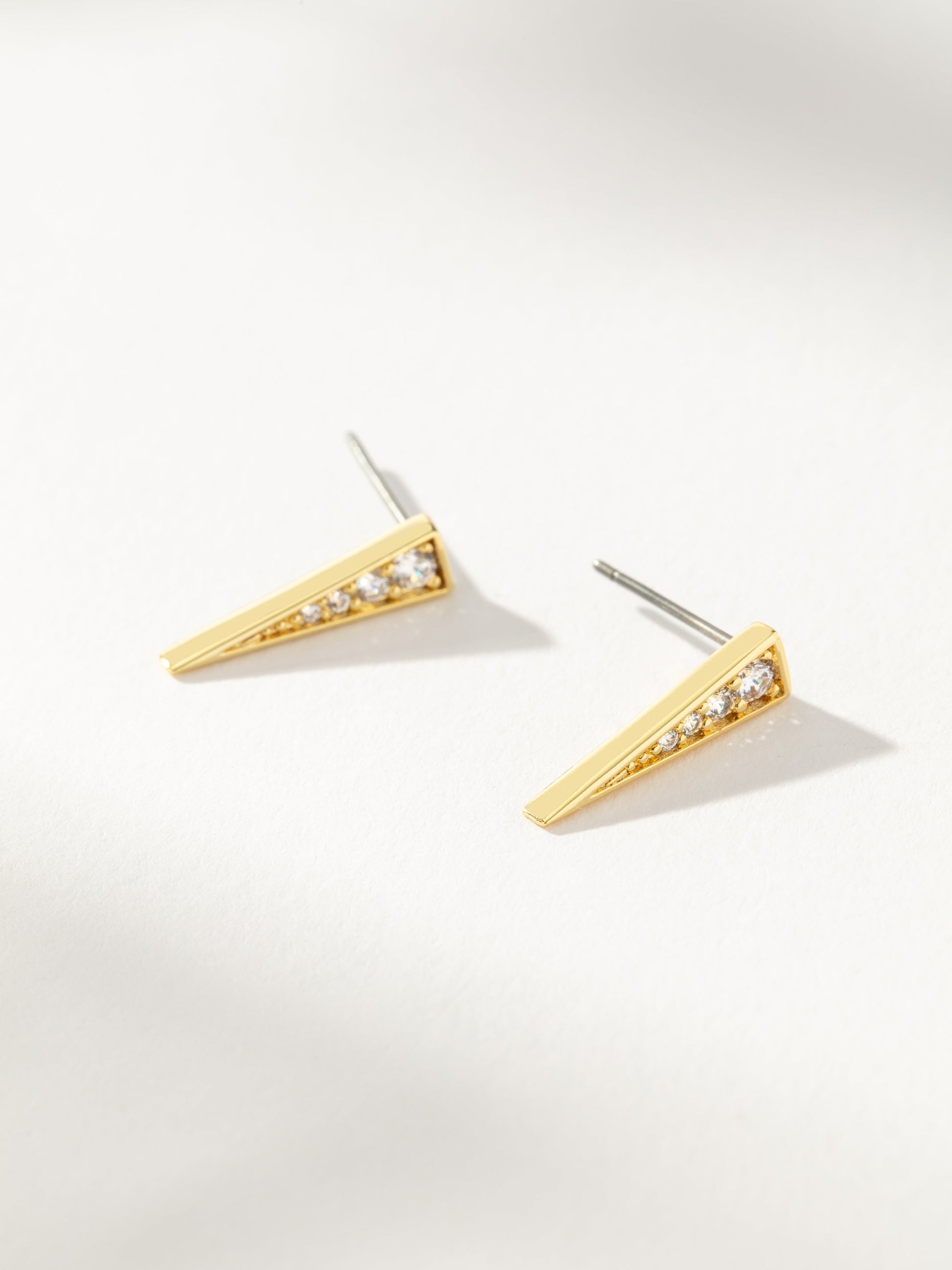 Make a point with these unique triangle stud earrings. With cubic zirconia gems, these studs not only bring some shine to your look, but they also add some length and edge to your ear stack. For a full look, pair these gold earrings with our Going Solo Huggie and Simple Shine Ear Cuff.