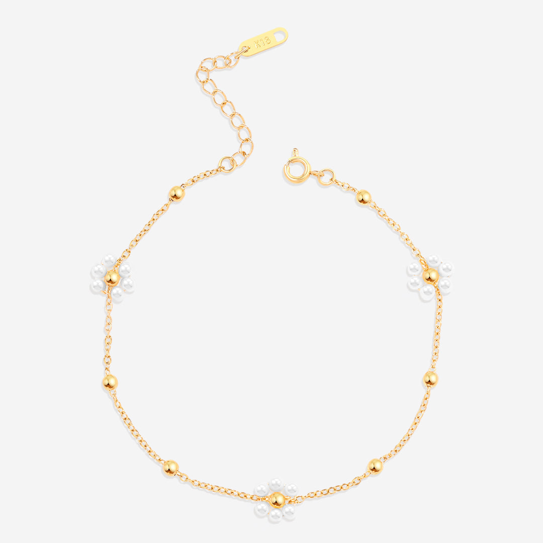 Mint & Lily's Marguerite Pearl Anklet is a delightful accessory that features delicate pearl daisies beautifully strung along a fine chain. Each daisy is crafted from lustrous pearls, adding a touch of charm and elegance to your ankle.