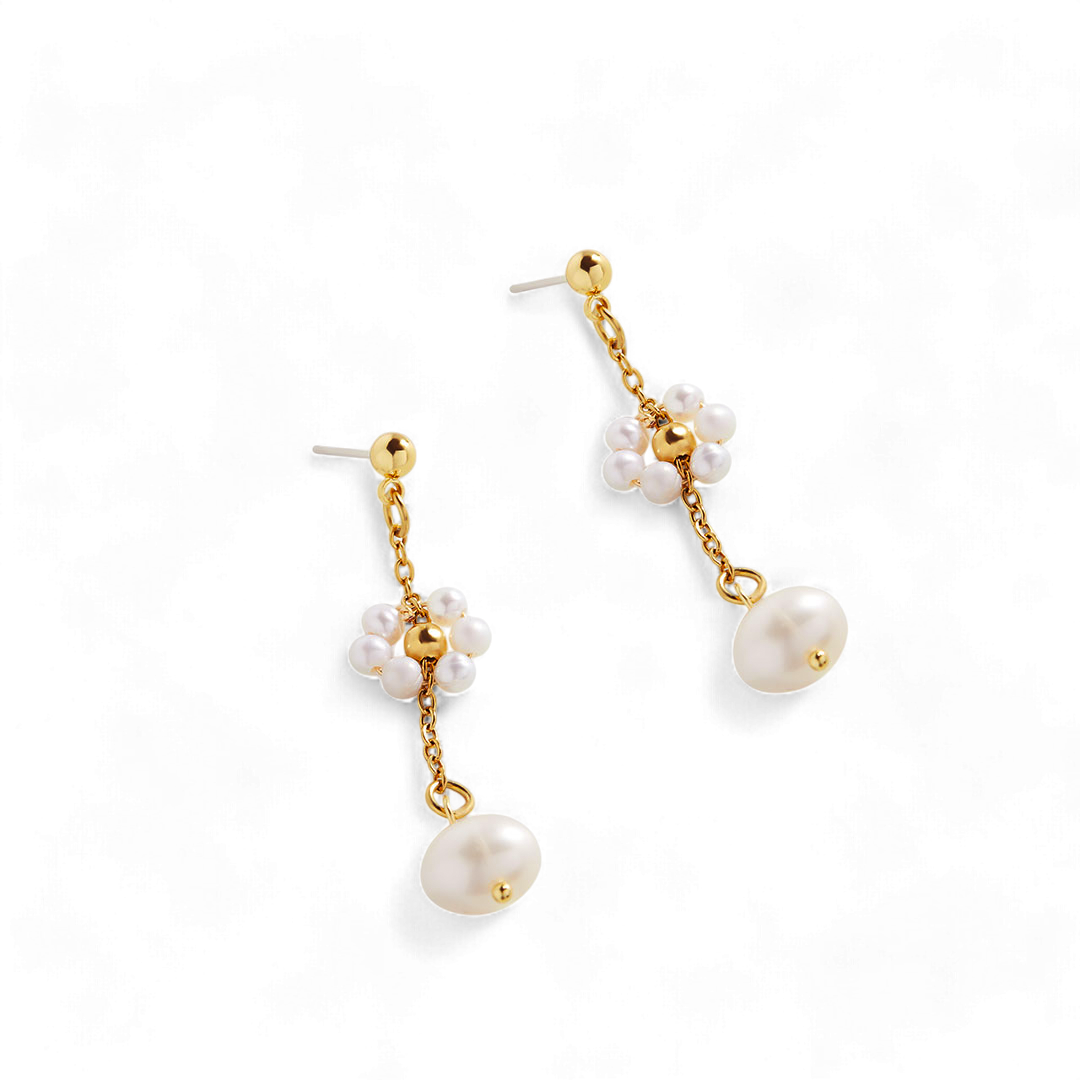 Mint & Lily's Marguerite Pearl Earrings are a stunning blend of elegance and whimsy, featuring delicate pearl daisies that dangle gracefully. Each earring showcases beautifully crafted pearls, forming charming floral motifs that catch the light with every movement.