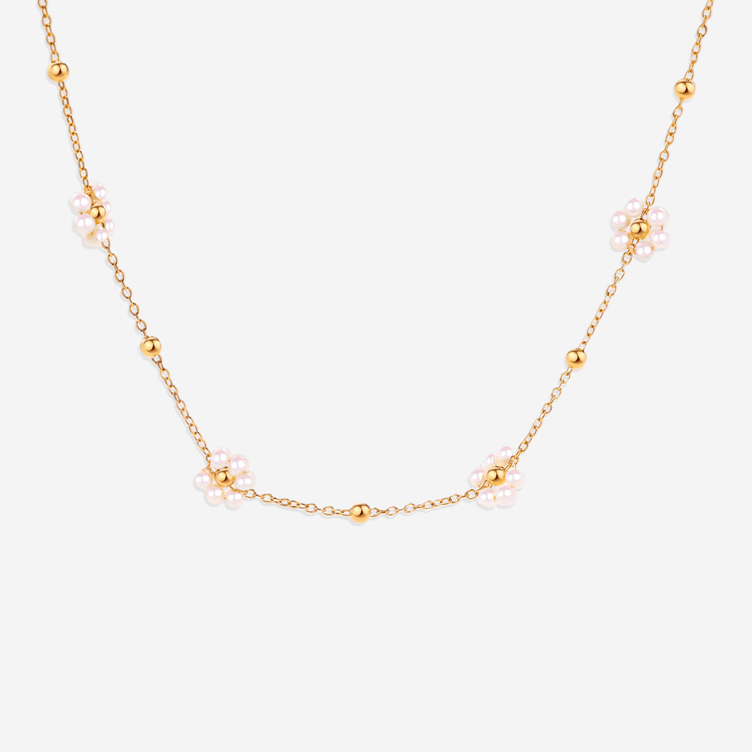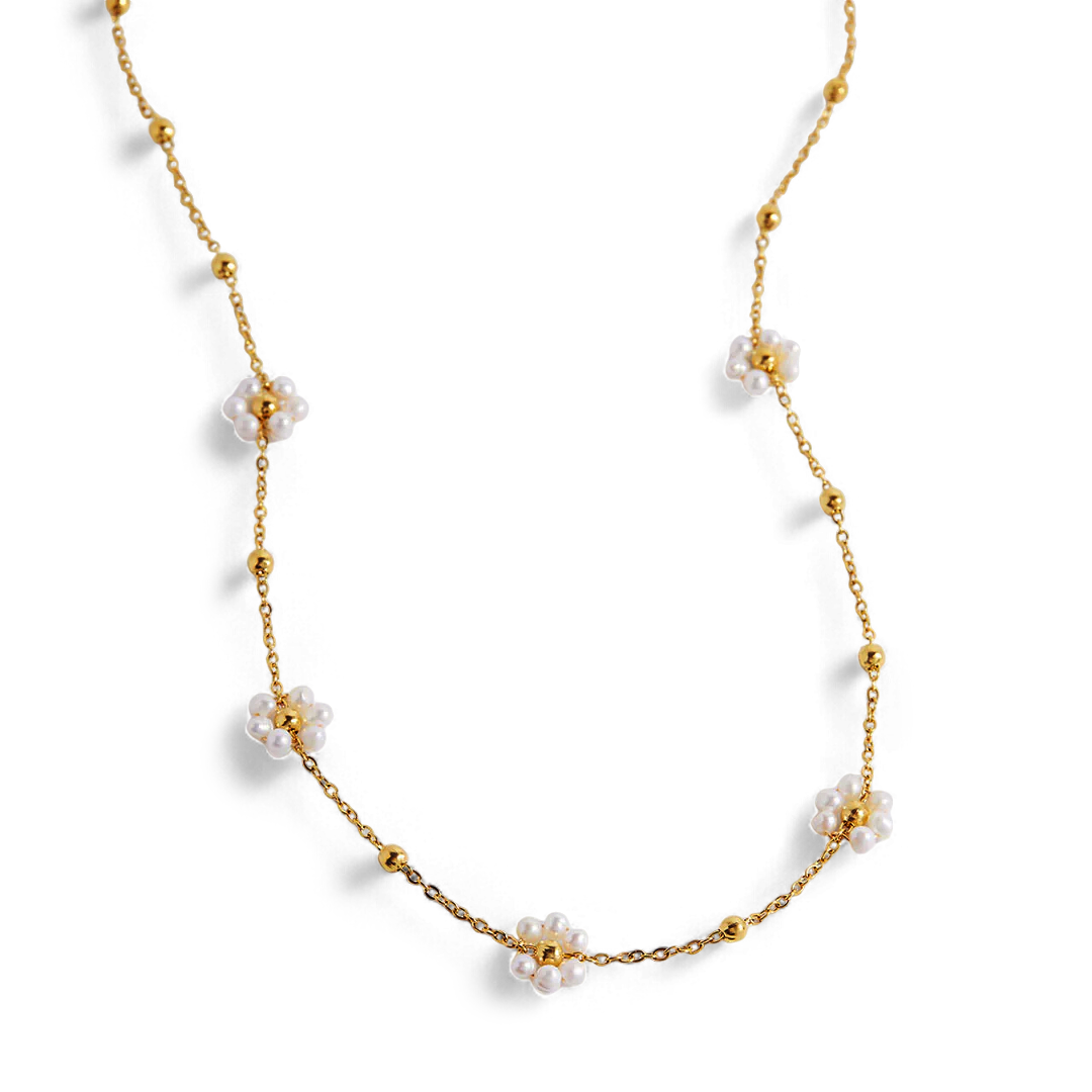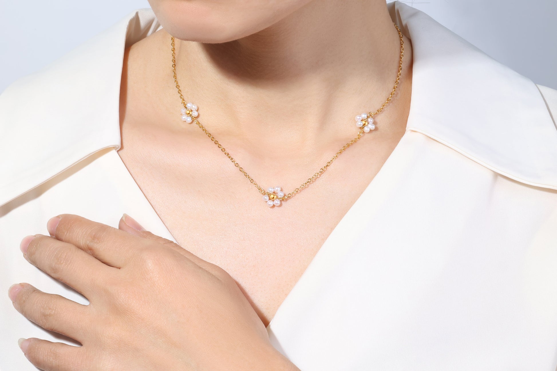 Mint & Lily's Marguerite Pearl Necklace is a delightful and feminine accessory that features charming pearl daisies delicately arranged along a sleek choker band. Each daisy is crafted from luminous pearls, adding a touch of elegance and whimsy to the design.