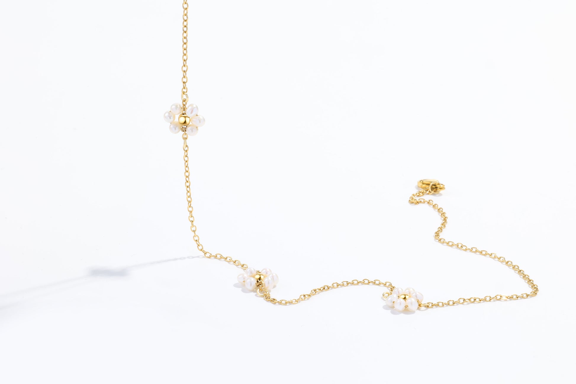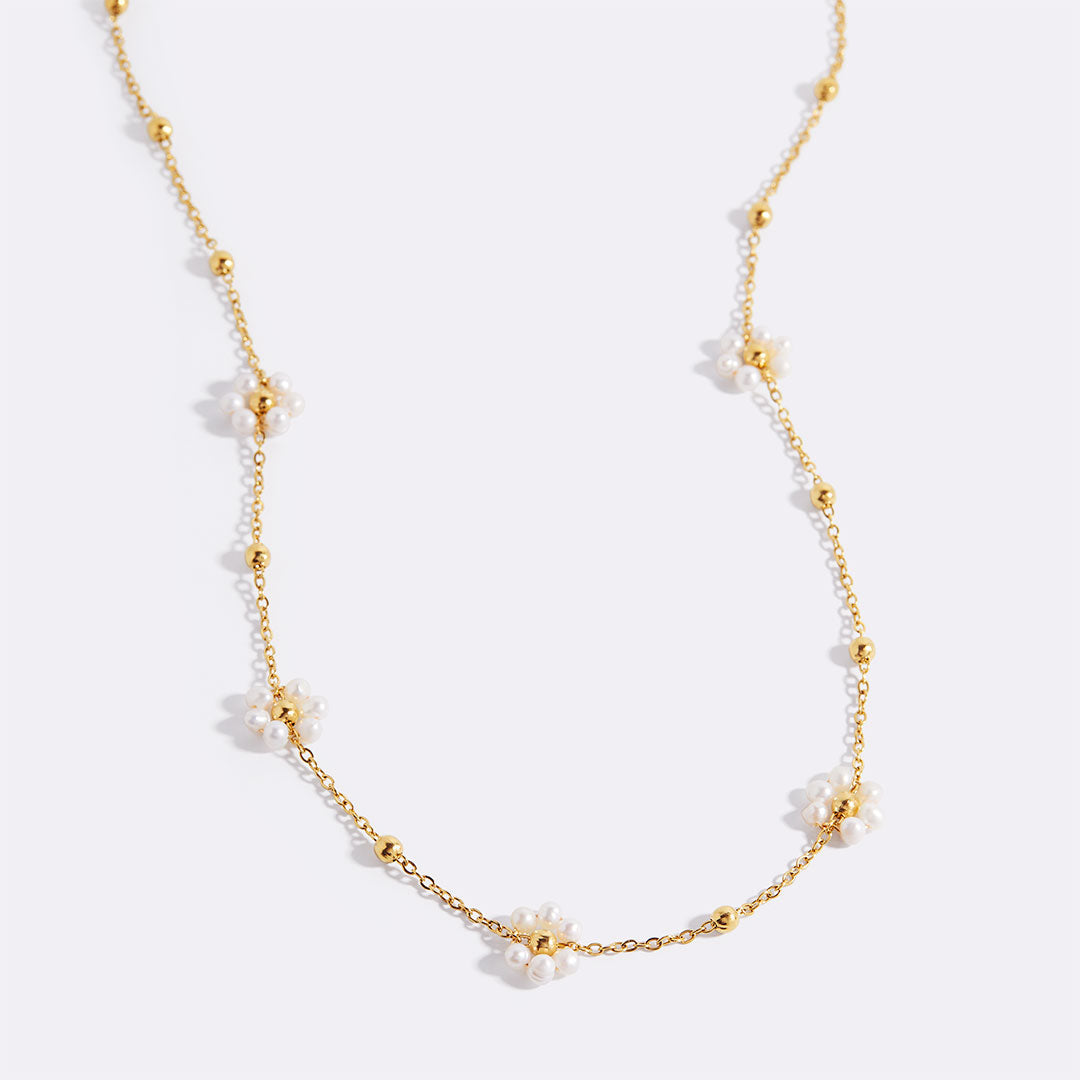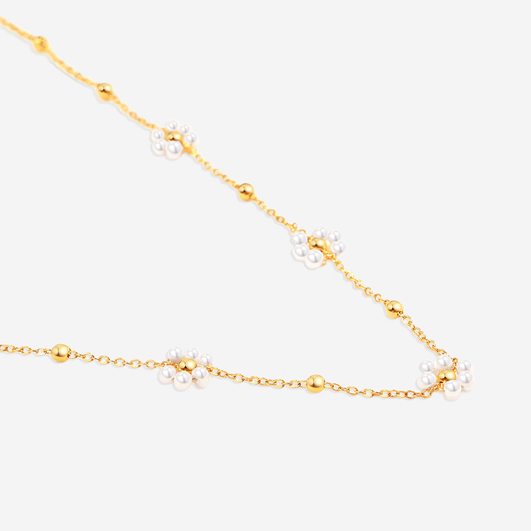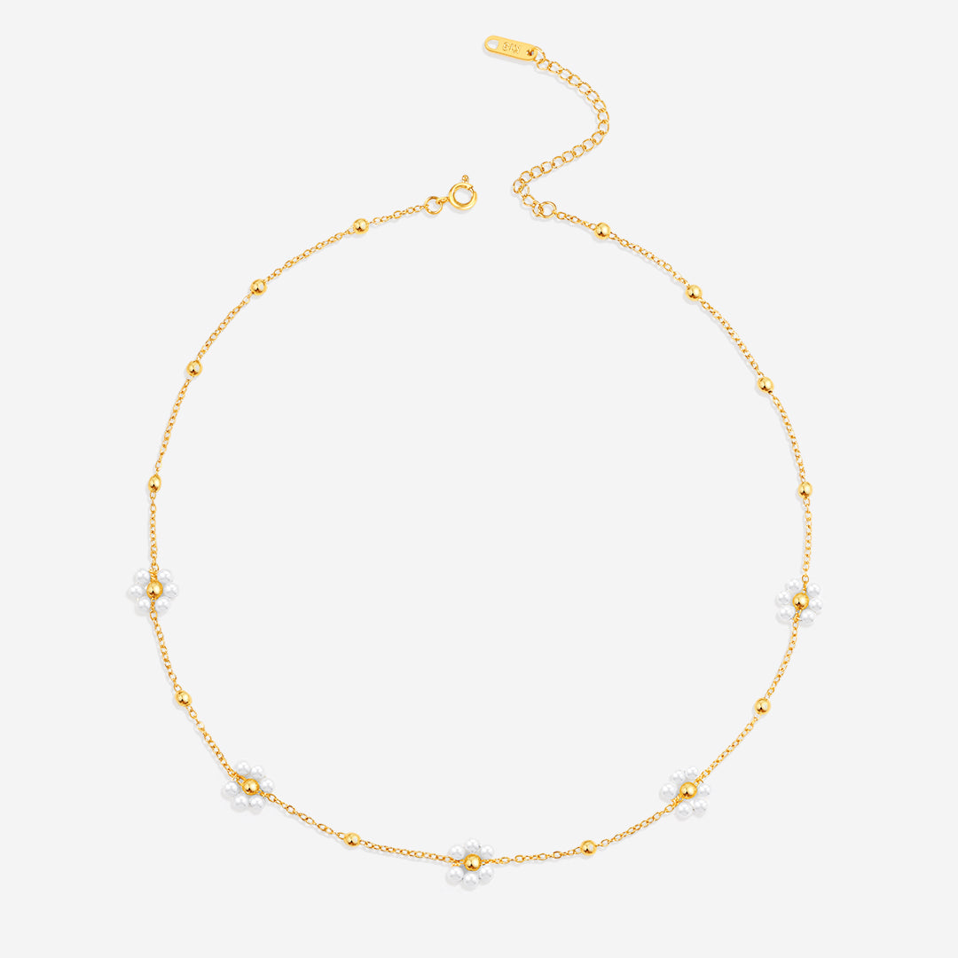 Mint & Lily's Marguerite Pearl Necklace is a delightful and feminine accessory that features charming pearl daisies delicately arranged along a sleek choker band. Each daisy is crafted from luminous pearls, adding a touch of elegance and whimsy to the design.