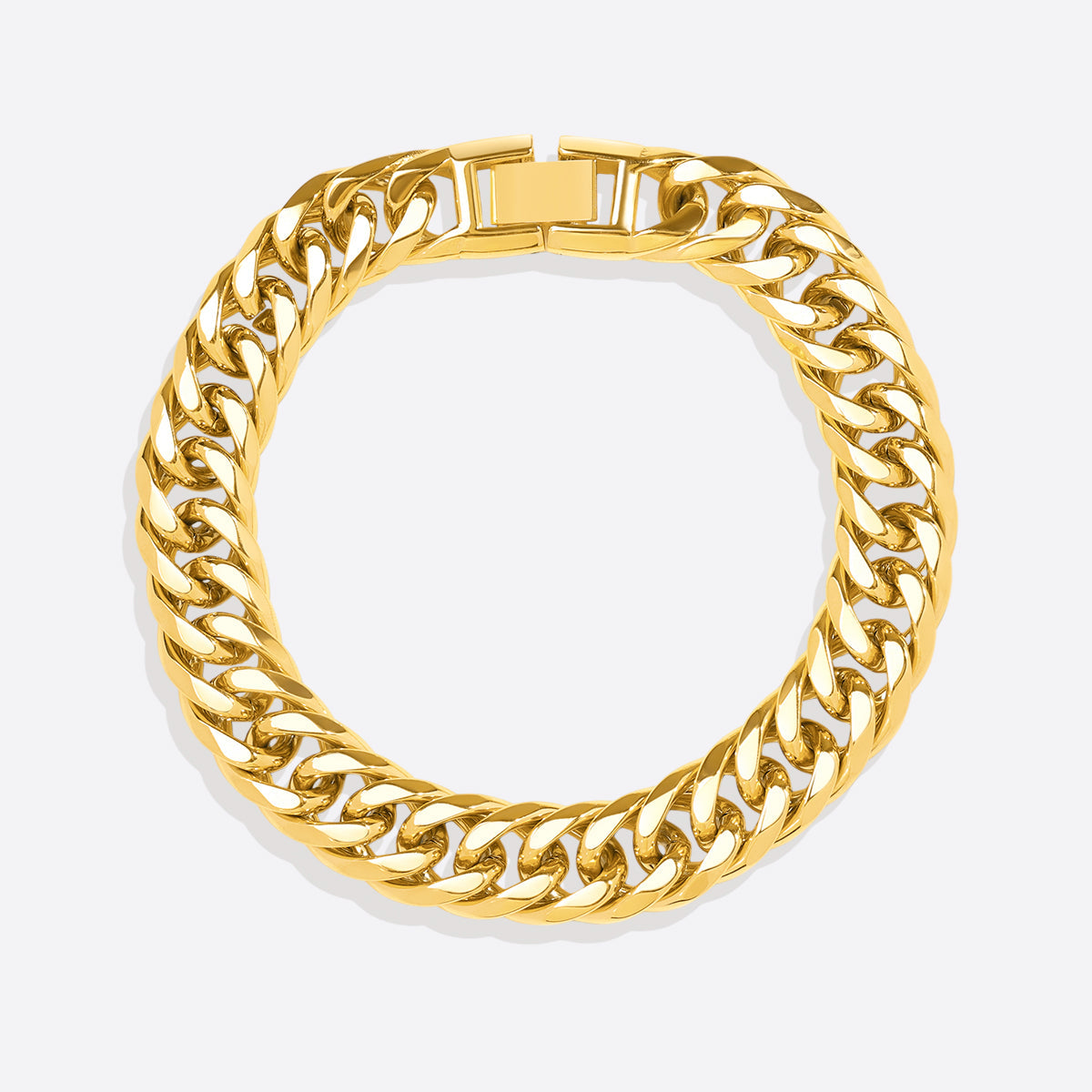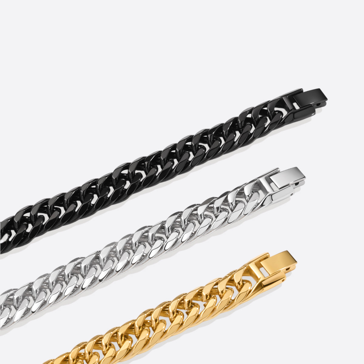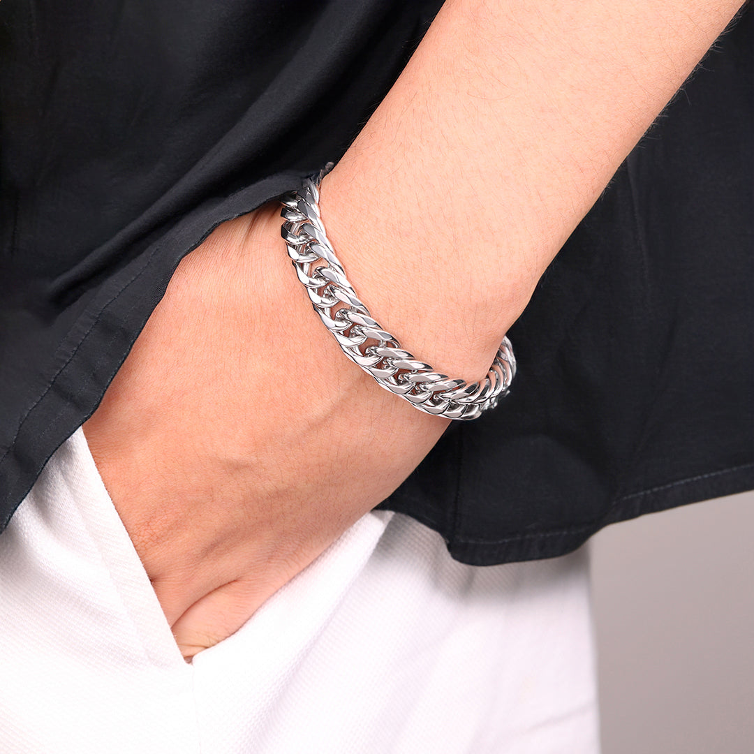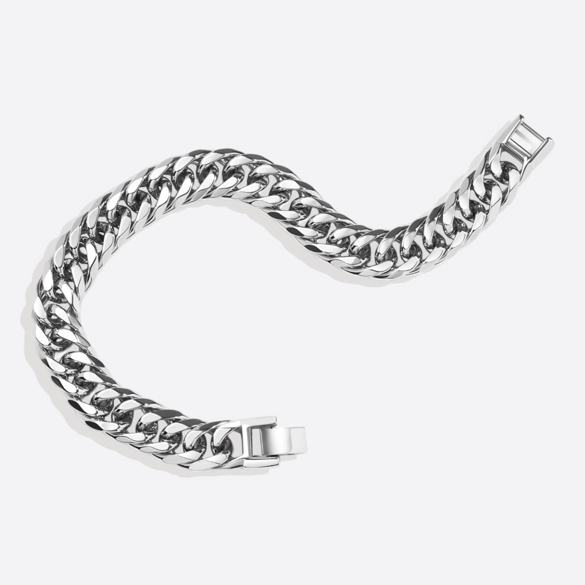 This substantial piece features thick, interlocking curb links that make a strong visual statement. Crafted from durable materials with a sleek finish, this bracelet exudes rugged elegance and modern style, making it suitable for everyday wear or as a standout accessory for special occasions.