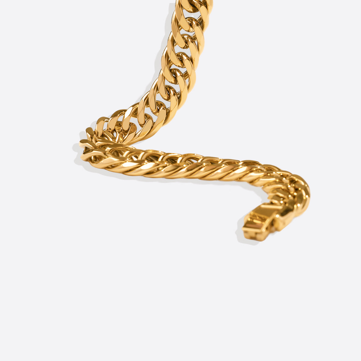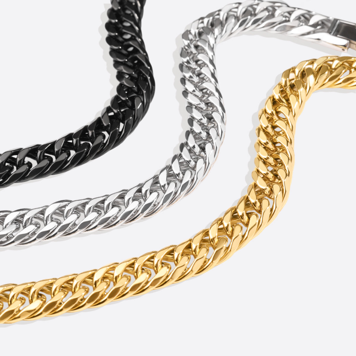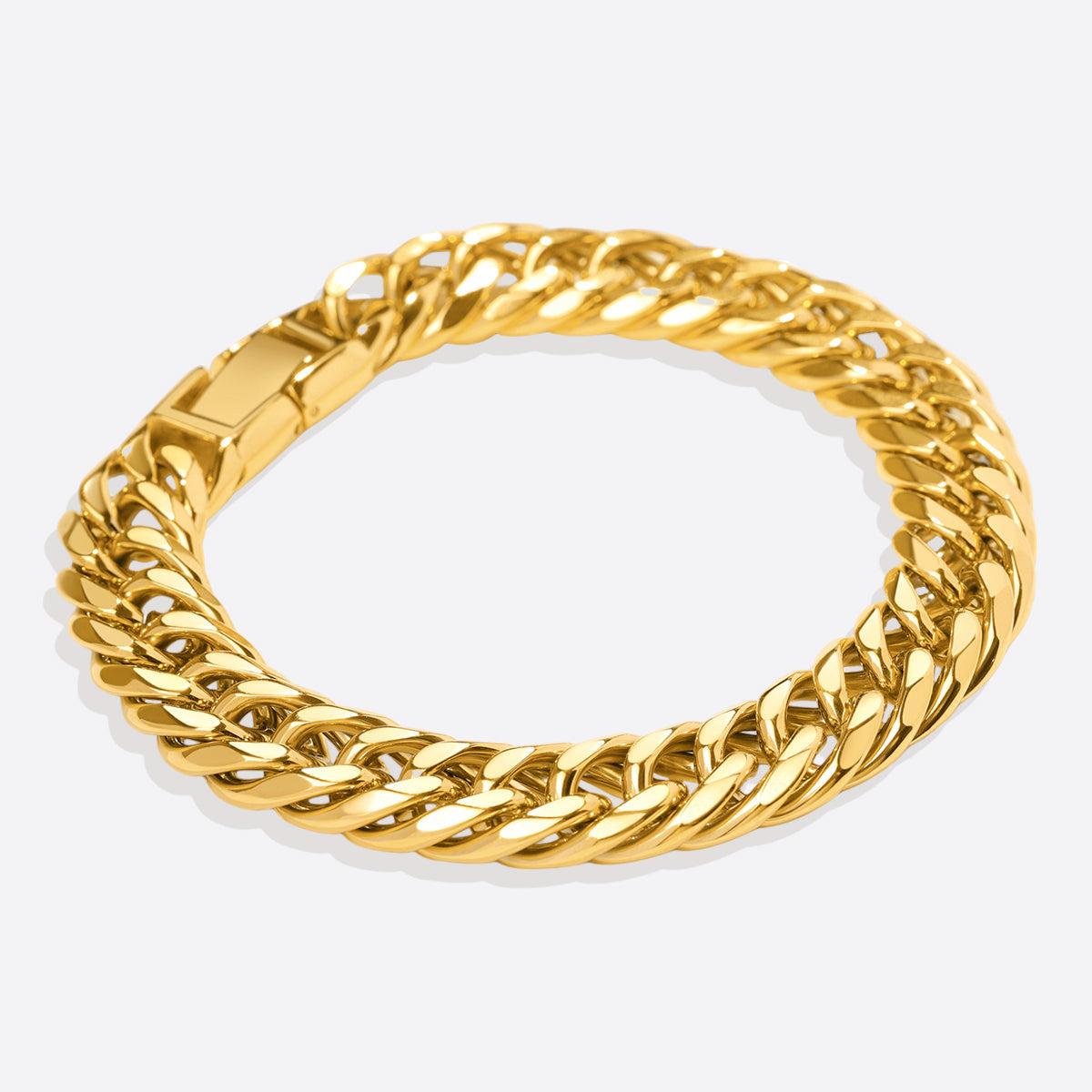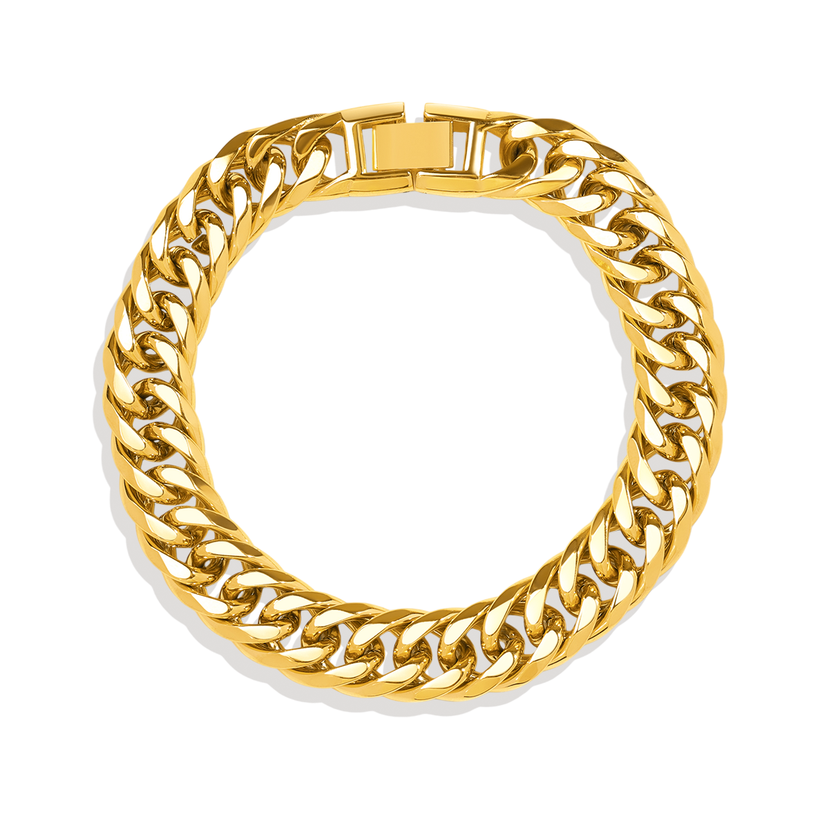 This substantial piece features thick, interlocking curb links that make a strong visual statement. Crafted from durable materials with a sleek finish, this bracelet exudes rugged elegance and modern style, making it suitable for everyday wear or as a standout accessory for special occasions.