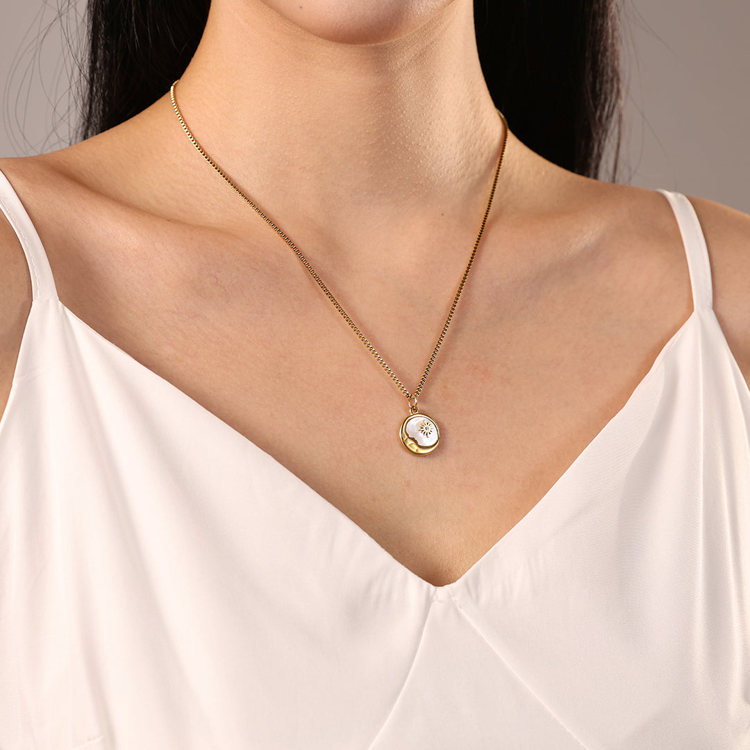 Suspended from a delicate chain, this necklace is perfect for layering or wearing solo as a standout piece. Ideal for everyday wear or special occasions, the Mother of Pearl Moon Pendant Necklace combines natural beauty with elegant design, making it a timeless addition to your jewelry collection.