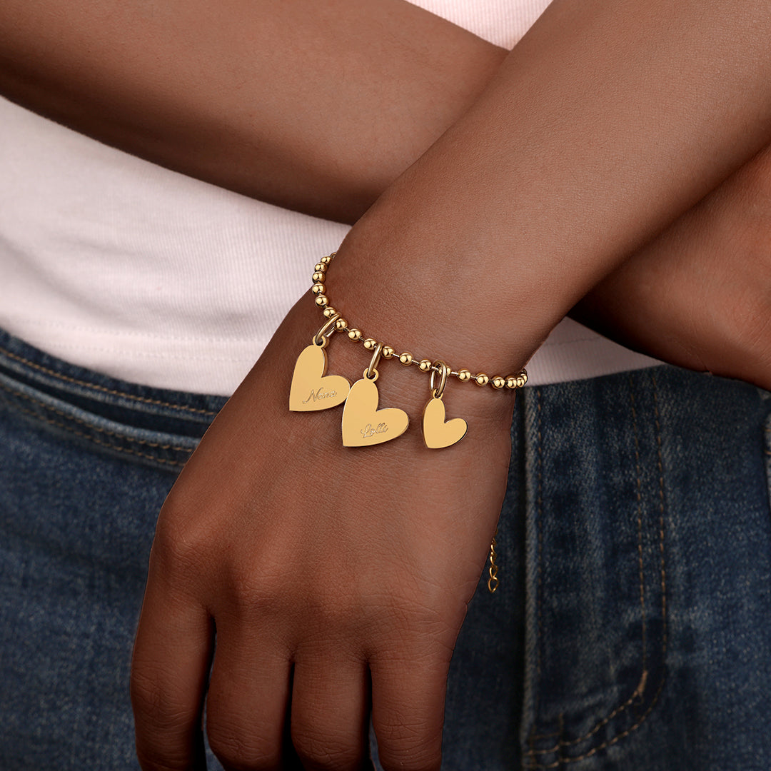This charming piece features a duo of heart charms on a beaded bracelet, customizable with initials or a name. Its versatile design ensures it complements any style, making it a perfect addition to any jewelry collection.