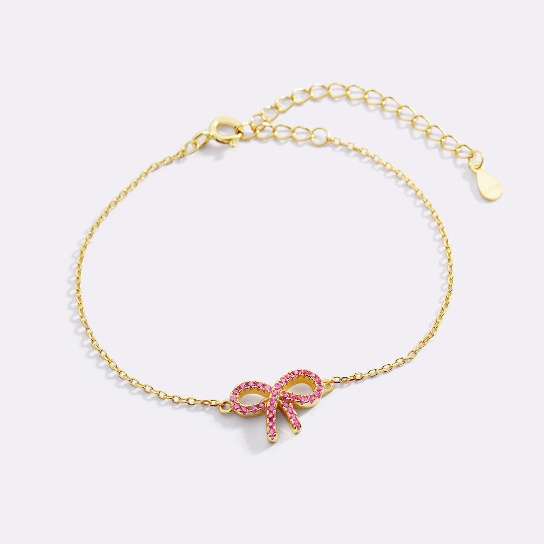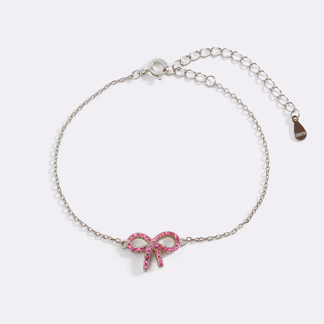 Mint & Lily's Pink Pave Bow Bracelet is a charming and elegant piece that combines playful design with sophisticated sparkle. The bracelet features a delicate bow charm adorned with pink pave stones that catch the light beautifully.