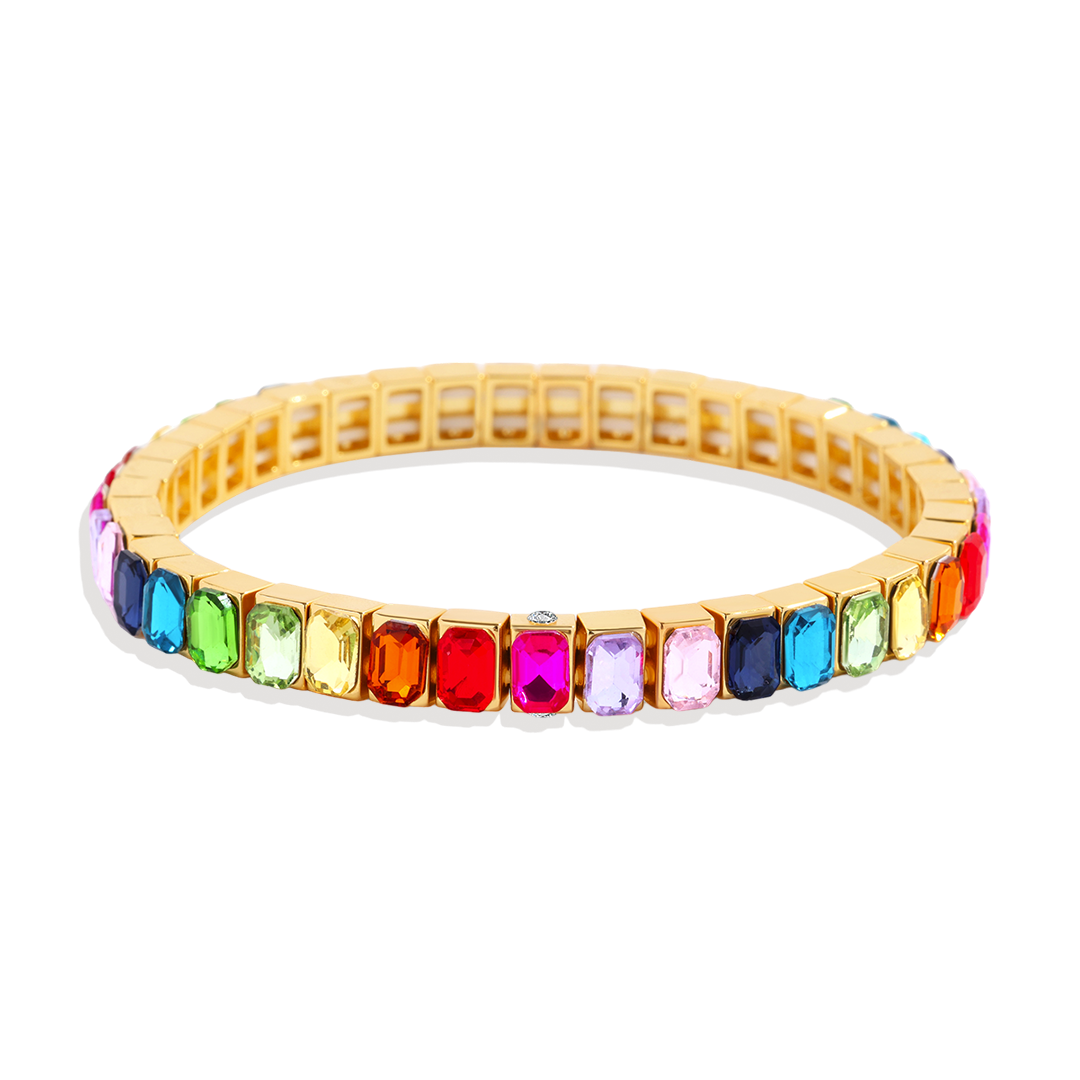 Mint & Lily's Rainbow Baguette Beaded Bracelet features a vibrant array of baguette gemstone beads, artfully arranged to create a colorful and eye-catching design. The stretchy band ensures a comfortable fit, making it easy to wear and style.