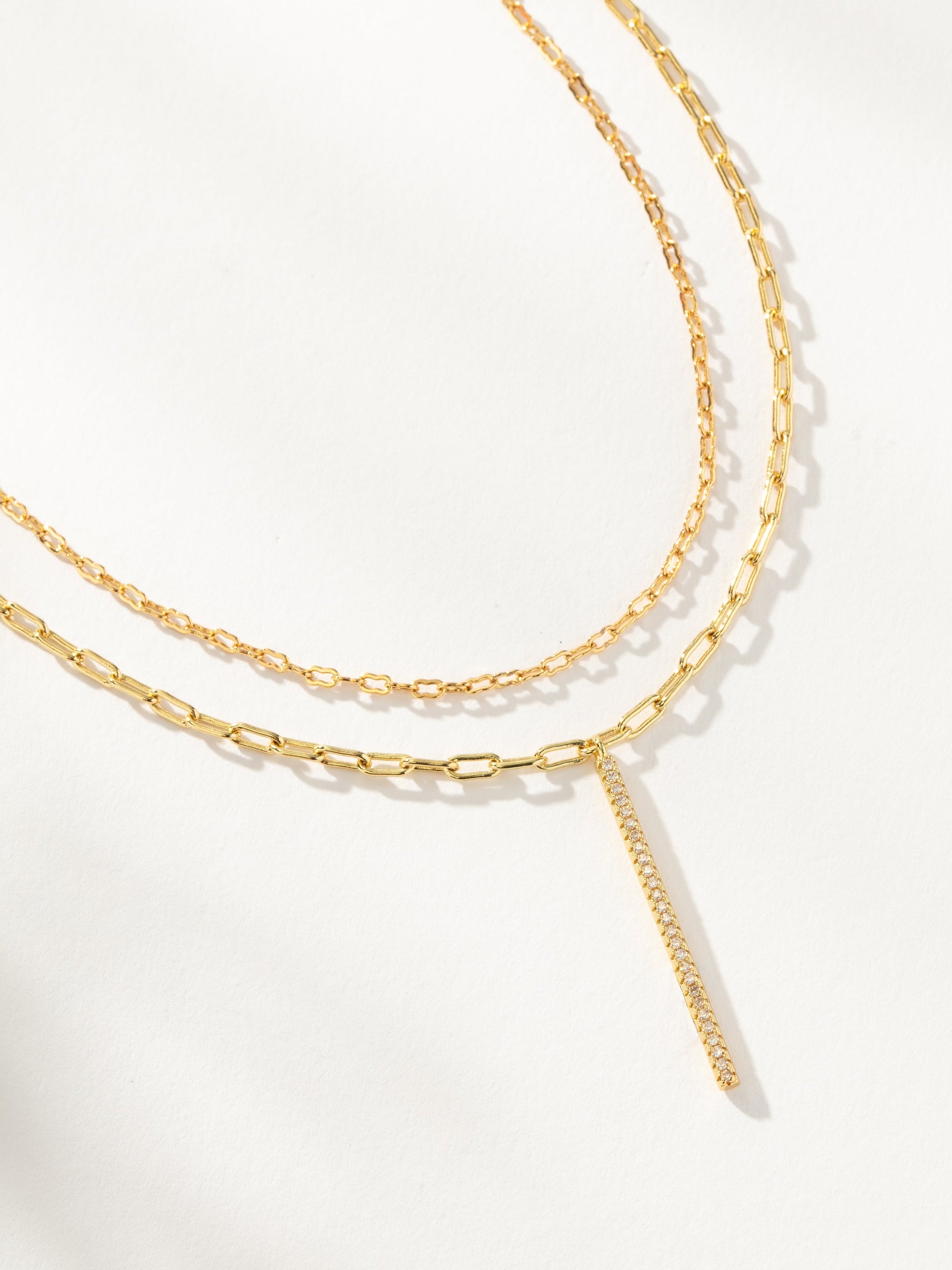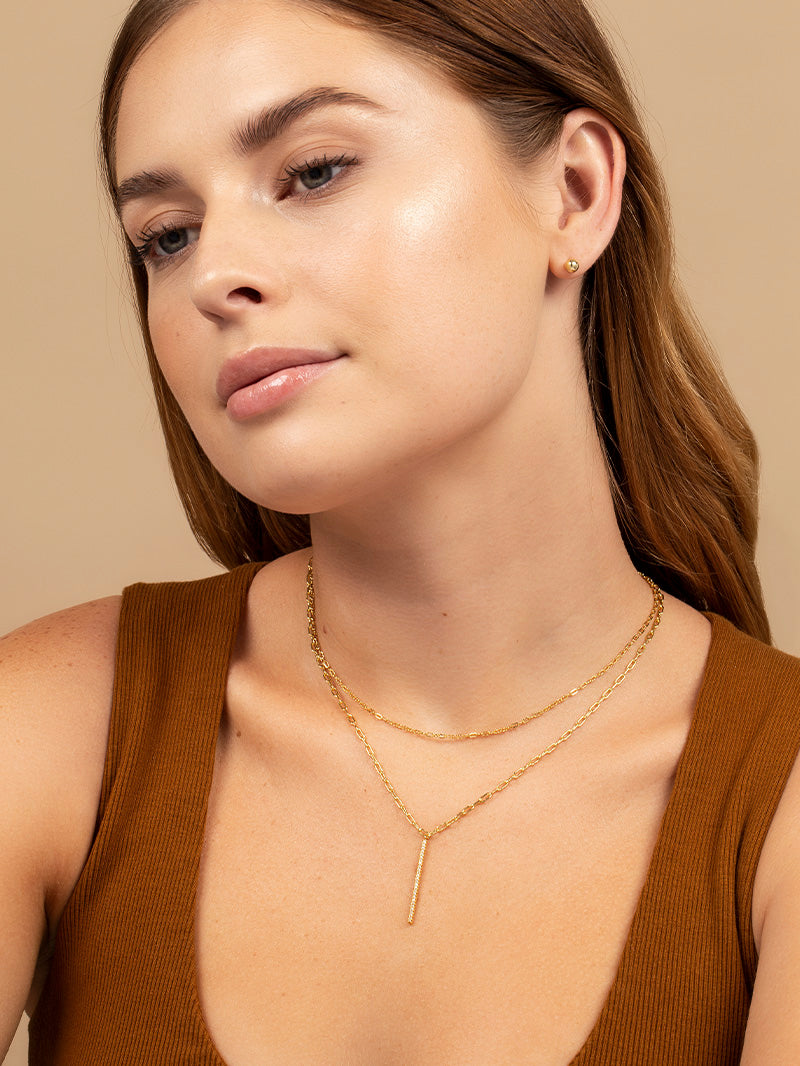 We did the layering for you in our Simple Double Chain. Two layers of classic gold chains and a gold bar with pavé detail are all you need for any look.