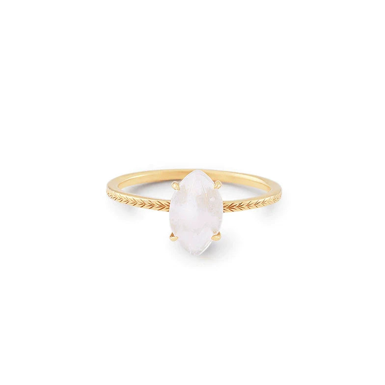 Set in a delicately gold-plated band, the shimmering iridescence of the moonstone captures the essence of light and purity, making it a timeless treasure that pairs effortlessly with elegance and meaning.