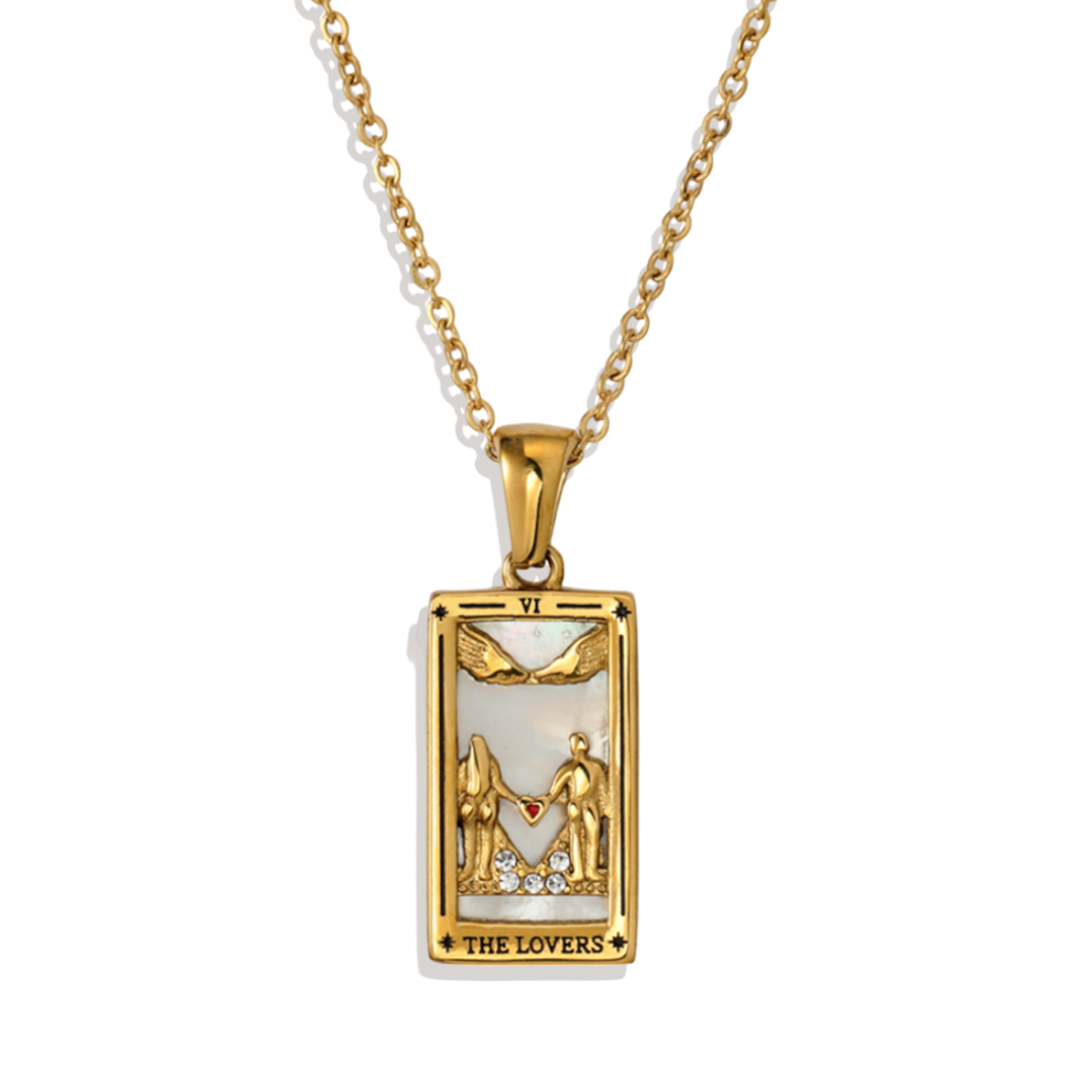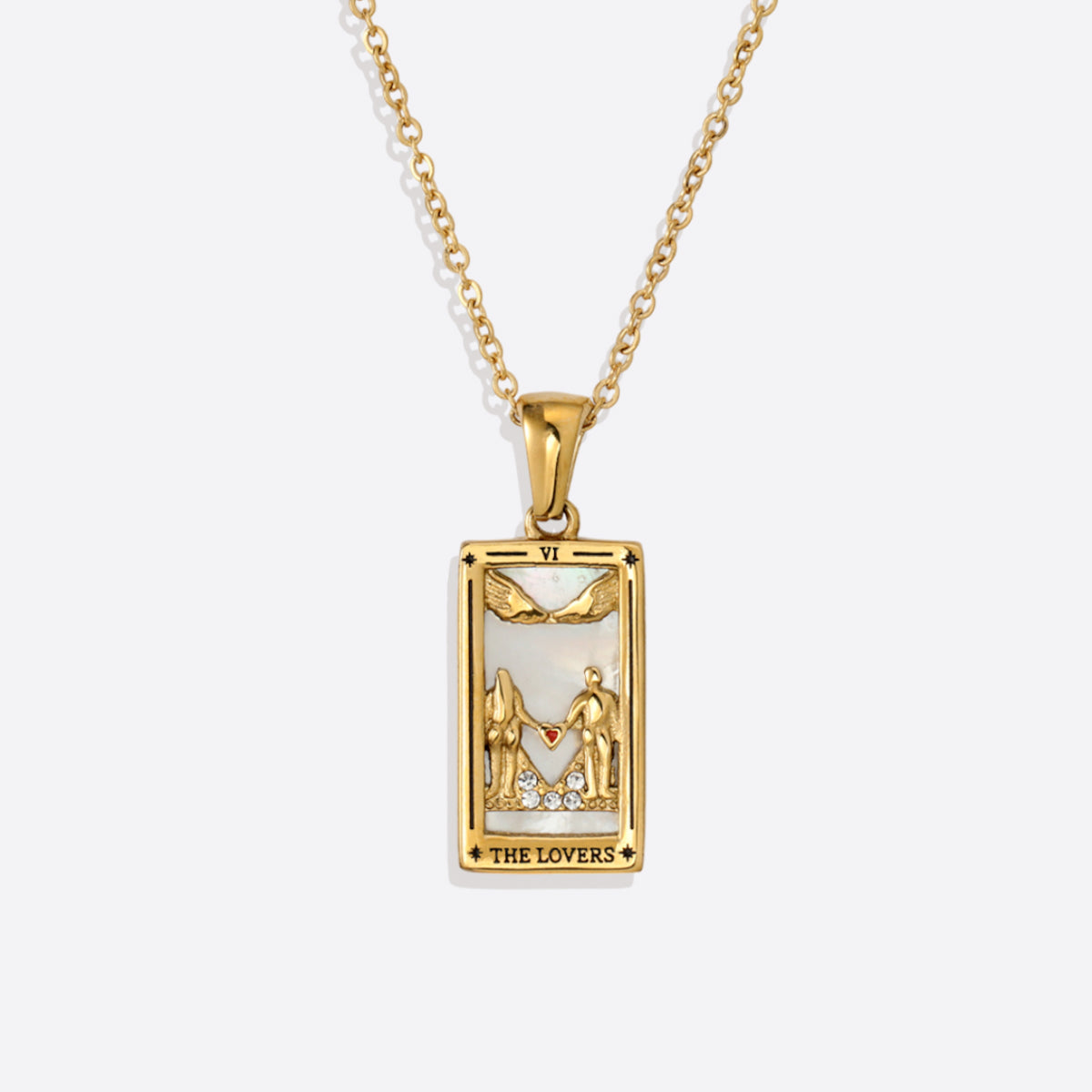 Mint & Lily's The Lovers Tarot Necklace beautifully encapsulates the themes of love, harmony, and partnership, inherent to The Lovers card in tarot. This elegant necklace features a pendant detailed with the iconic imagery of The Lovers, symbolizing connection and meaningful relationships. Whether worn as a testament to romantic love, friendship, or self-love, this piece serves as a daily reminder of the importance of relationships in our lives. It’s an ideal accessory for anyone who values deep connections, making it a perfect gift for a loved one or a personal keepsake to cherish.